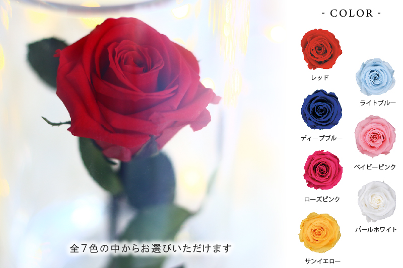 レッド 大好きな人への贈り物として 「あなたを愛してます」「愛情」 ディープブルー, ライトブルー 夢に向かって頑張る人へ 「夢かなう」「奇跡」「神の祝福」 ローズピンク, ベイビーピンク 恋人との記念日や感謝の贈り物として 「気品」「感謝」「愛の誓い」 パールホワイト フォーマルな贈り物に 「深い尊敬」「純潔」「清純」 サンイエロー 家族や友達へのギフトとして 「友情」「平和」「可憐」