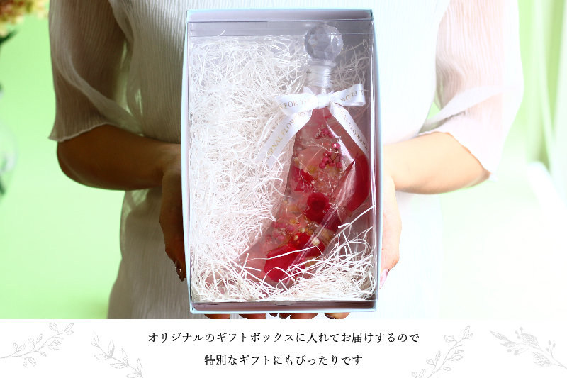 「バラの花束を渡すのは照れくさい」という男性の方でも 日頃の気持ちを伝えるギフトにオススメのアイテムです。 ゴールドの文字がキラリと光るリボンには 「いつまでもフラワリウムの花を楽しんでほしい」 という願いを込めて 「Eternal flowers for you」 というメッセージが刻まれています。 光沢のある上品なデザインでギフトシーンに華やかさをプラスします。