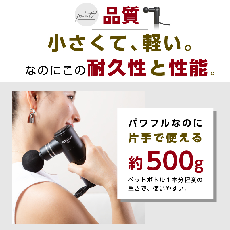 ・iPhone11とほぼ同じサイズ感 ・転速度3200rpm ・連続使用2時間 ・4段階強度 ・肩、腰、腕、足裏など様々な部位に最適なアタッチメント4種付き ・持ち運びに便利な収納ポーチ付き ・アルミ合金の丈夫でスタイリッシュなフォルム