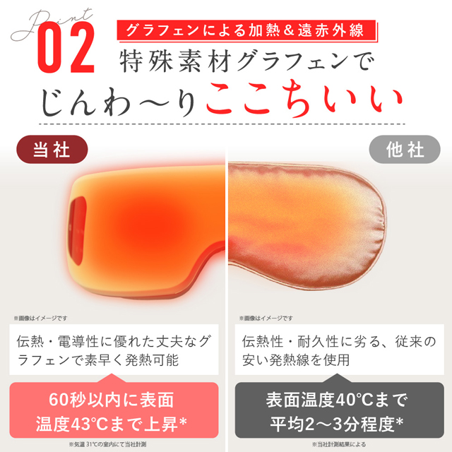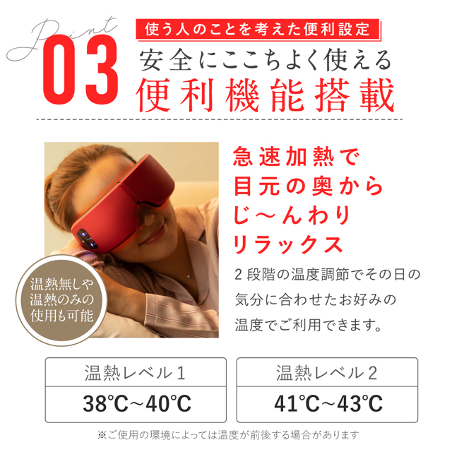 心地よい42°で目元をゆっくりと温めます。 あたためることで目も頭もリラックスできます。
