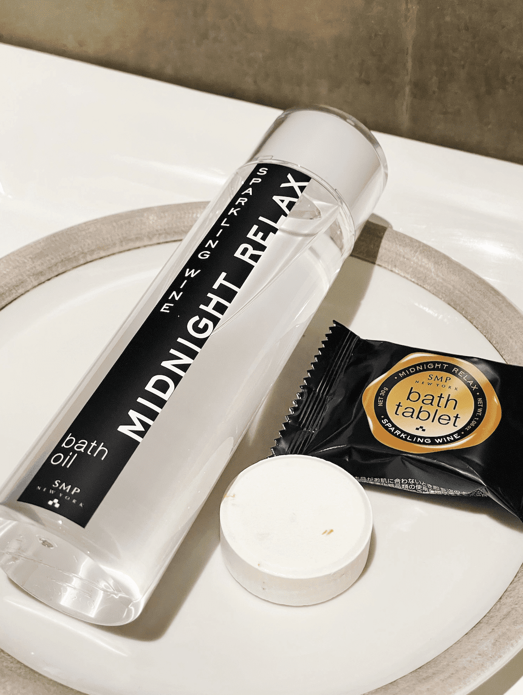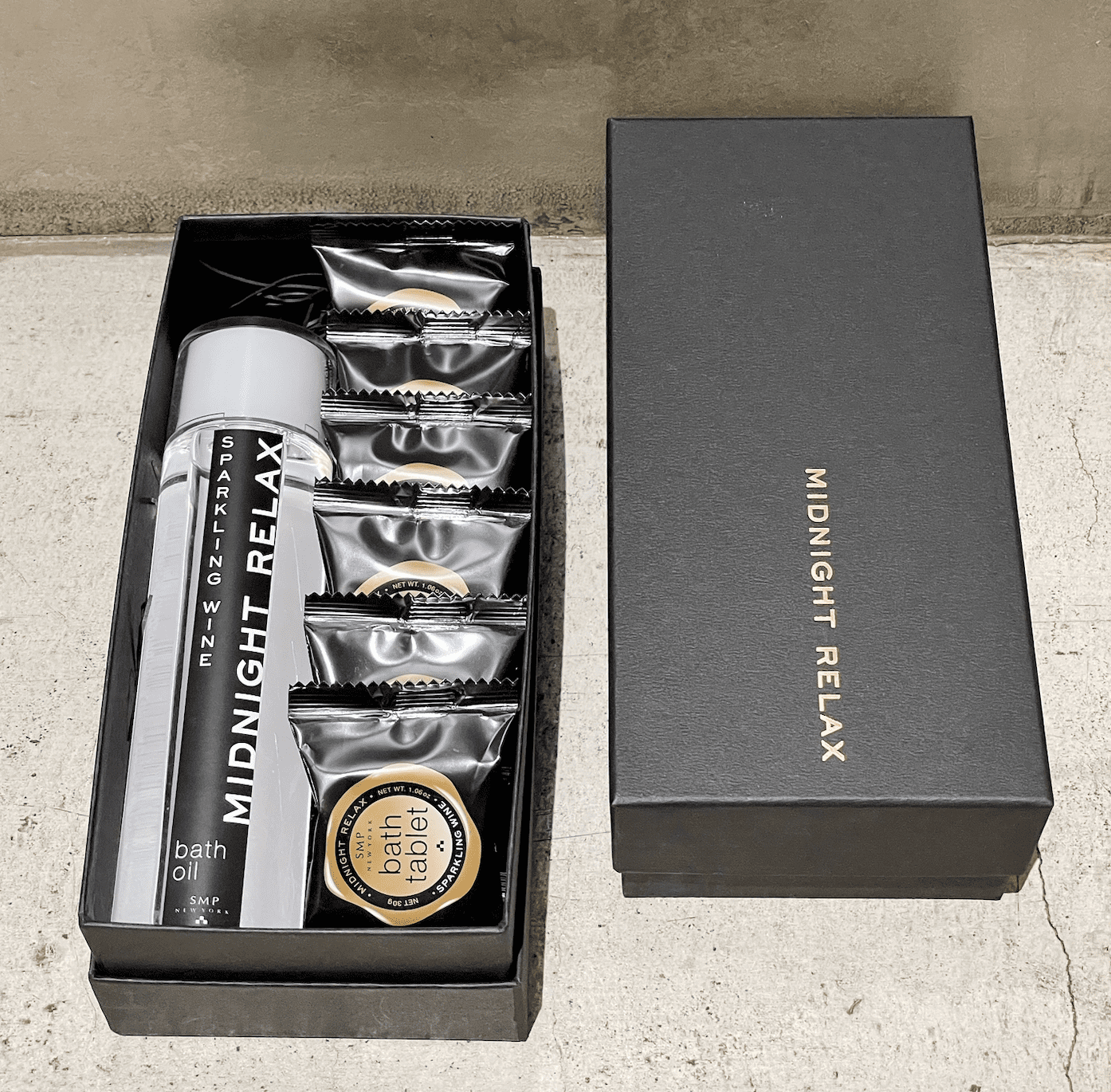 ミッドナイトリラックスシリーズは富山湾沖から採水された海洋深層水と深層水塩、北アルプス採水の温泉水、植物由来の保湿成分を配合しました。 バスタブレットはスパークリングワインの白ぶどうの色、フルーティな香り、繊細で美しい泡立ちをイメージした爽やかな発砲入浴剤です。 バスオイルはスパークリングワインの白ぶどうの色、フルーティな芳醇なイメージした爽やかなミルキー/白濁タイプ。透明とシャンパンカラーの二層式になった入浴剤です。 ※バスオイルのカラーは温度変化、天然の原料成分の個体差により透明化する場合がございます。
