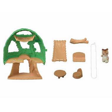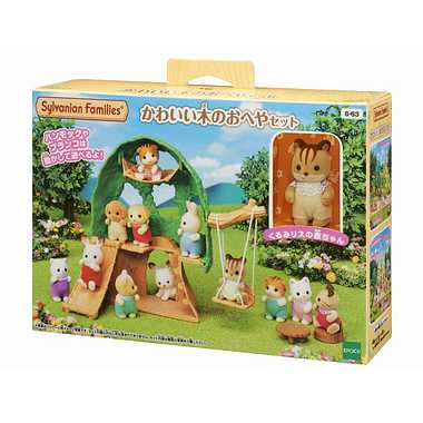 かわいらしい木のおへやと くるみリスの赤ちゃんのセットです。ハンモックやすべり台 ブランコなどがあり 赤ちゃんを遊ばせて楽しむことができます。葉っぱの間から外をのぞかせることもできます。