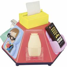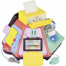 一番下の3つのボタンを押すと、ニュース、CM、ネット接続ボタンの音、、、。取り外して遊べ、片付けるときには型はめ遊びも!