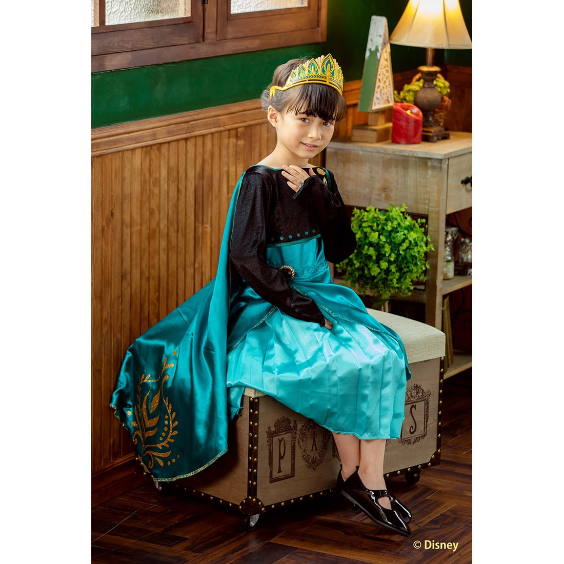 大口注文・法人のお問い合わせはこちら映画『アナと雪の女王2』でアナが着ているドレスです。 高級感のある黒のベロア生地に、グリーンのプリーツスカートがとってもおしゃれ。 ウエストのパープルのジュエルがアクセントになっています。 マントは外側がグリーン、内側がパープルの合わせ生地になっていて、クイーンらしい風格があります。