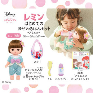 レミンのお人形(カバーオール、おむつ)×1、お花のかみかざり×1、ミルクびん×1、スタイ×1、くし×1、絵本(アリエルとにっこりミルク)×1