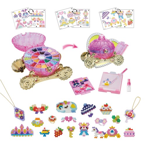 ・まるビーズ16色、キラキラビーズ8色 合計24色 約1700個 ・ケース、パレット、ホイールパーツ×2、フリップビーズトレイ、レシーバー、Wアクアビーズペン、きりふき、ネックレストップ2種、ゆびわ2種、バレッタ、ブレスレット、ティアラ、ボールチェーン、ネックレスチェーン、イラストシート3枚(6種)