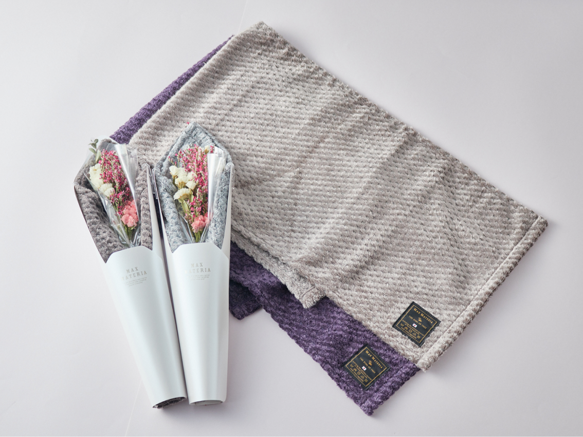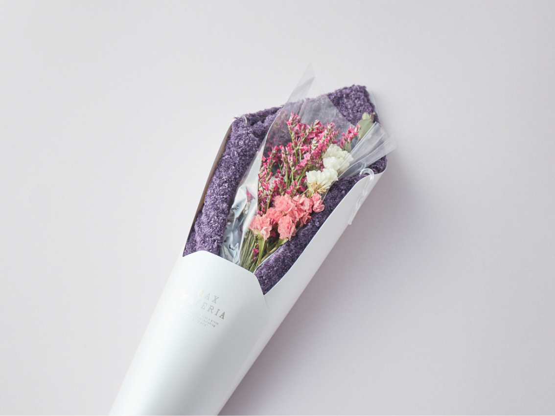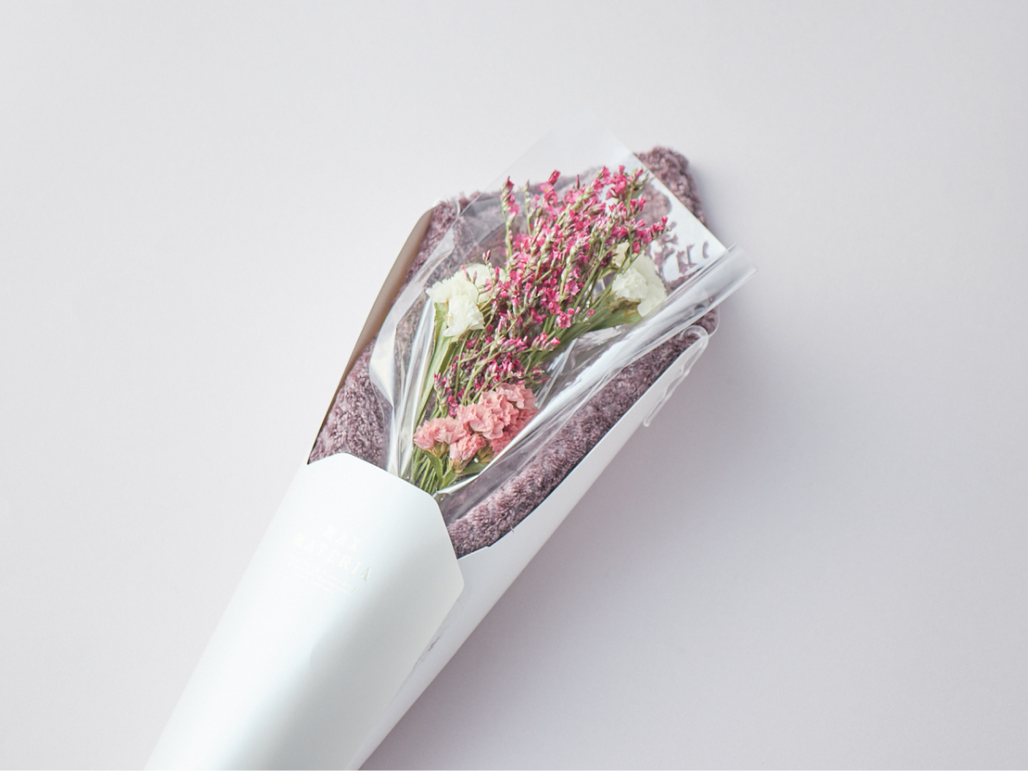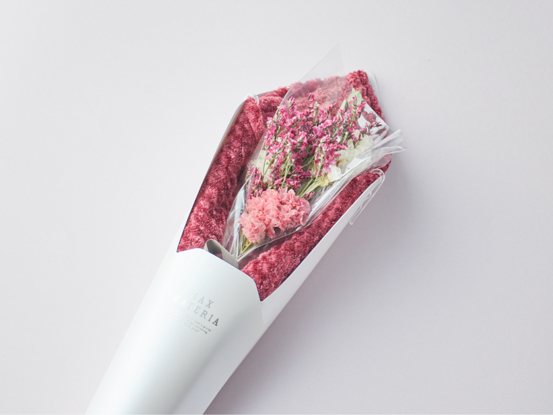 大口注文・法人のお問い合わせはこちら木から生まれた特別な高級素材を使用した、MAXMATERIA(マックスマテリア)の花束フェイスタオルです。 天然のお花を使用したドライフラワーがタオルに包まれており、見た目が華やかになる花束のようなデザイン。 お誕生日や結婚祝い、出産祝いなど幅広いシーンにぴったりなギフトです。