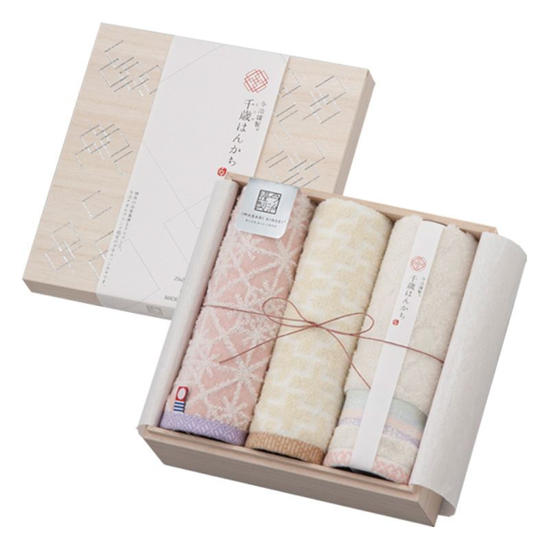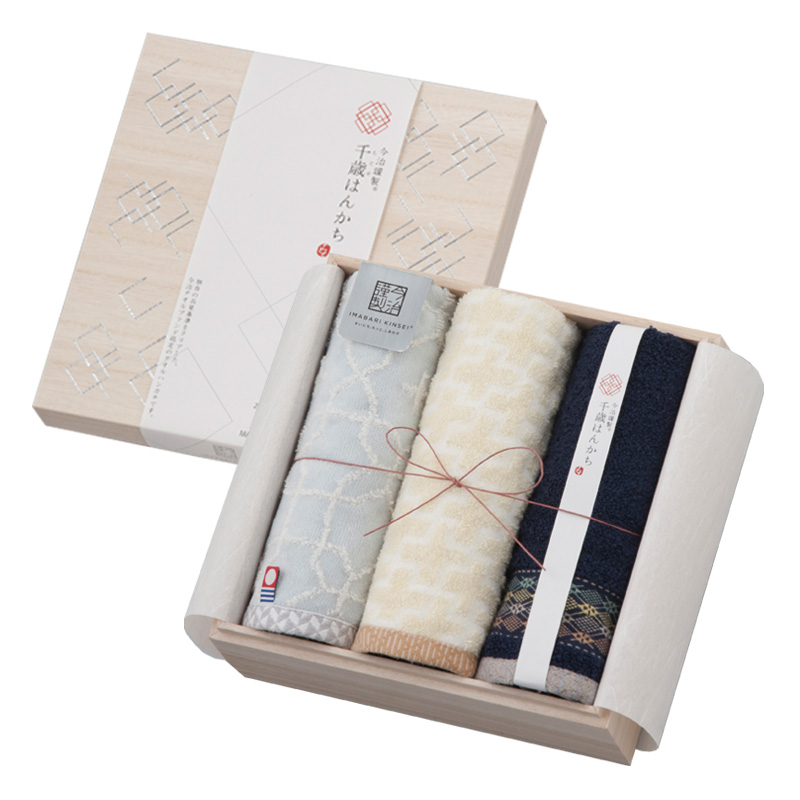 大口注文・法人のお問い合わせはこちら木箱に入った使い心地の良い今治のタオルハンカチを贈ってみませんか。 模様刺しをモチーフにした今治タオルのタオルハンカチはご縁が長く続きますようにとの思いから「千歳(ちとせ)はんかち」と名付けました。 贈った人と頂いた人のご縁がこの今治謹製千歳はんかちを通じて、より一層深く結ばれることを願っております。 タオルハンカチはイベントのノベルティ、ちょっとしたご挨拶ギフトやプラスワンの贈り物にも使っていただきやすいアイテムです。 先様に合わせて選んでいただきやすいように色柄を5パターンおつくりしたタオルギフトです。 大切なあの人へ、木箱に入った使い心地の良い今治のタオルハンカチを贈ってみませんか。