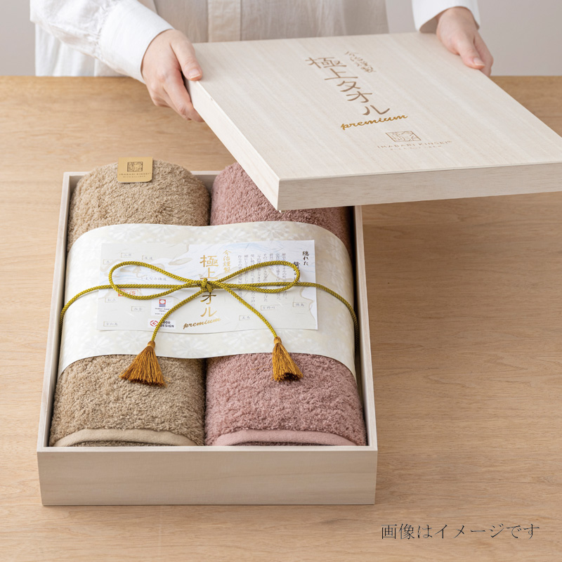 重厚な木箱が、「極上タオル」の良質さを引き立てます。 フタには極上タオルの名にふさわしい金の箔押しの「premium」の文字が刻印されています。 フタを開けると、タオルが花柄の和紙で包まれており、 最後に豪華な房付きの江戸打ち紐を巻かれ仕上げられております。