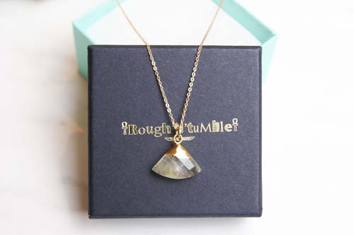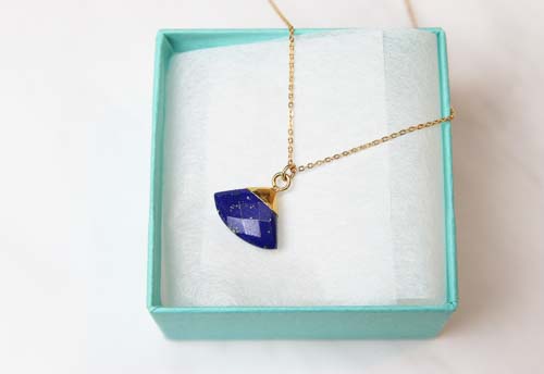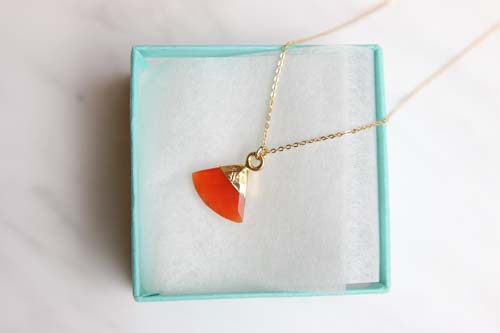 扇型にカットした天然石が個性的な印象のネックレス。 内側から滲むような美しさで胸元を優しく引き立てるアイテムです。自分へのご褒美、大切な方への贈り物にぴったりな商品です。