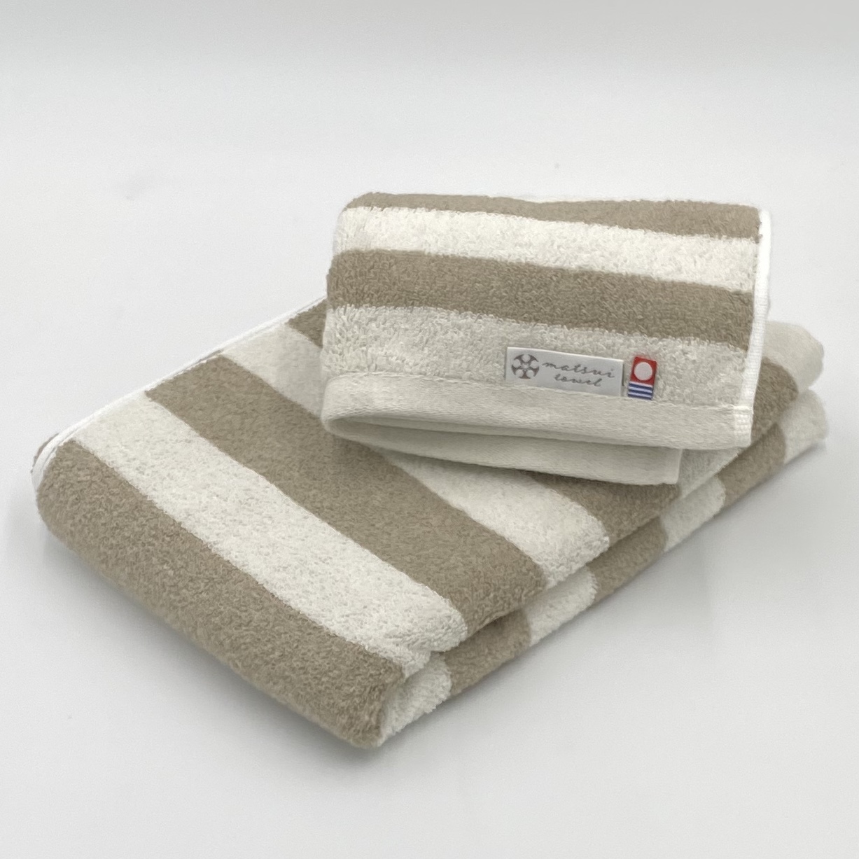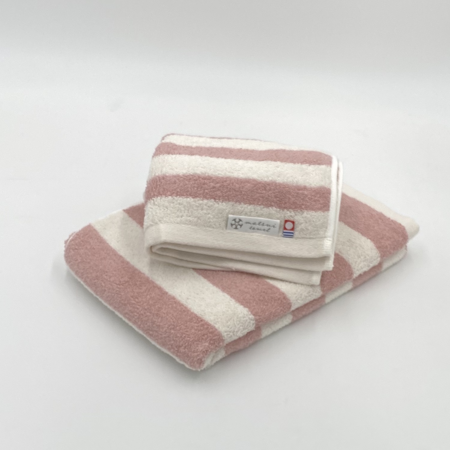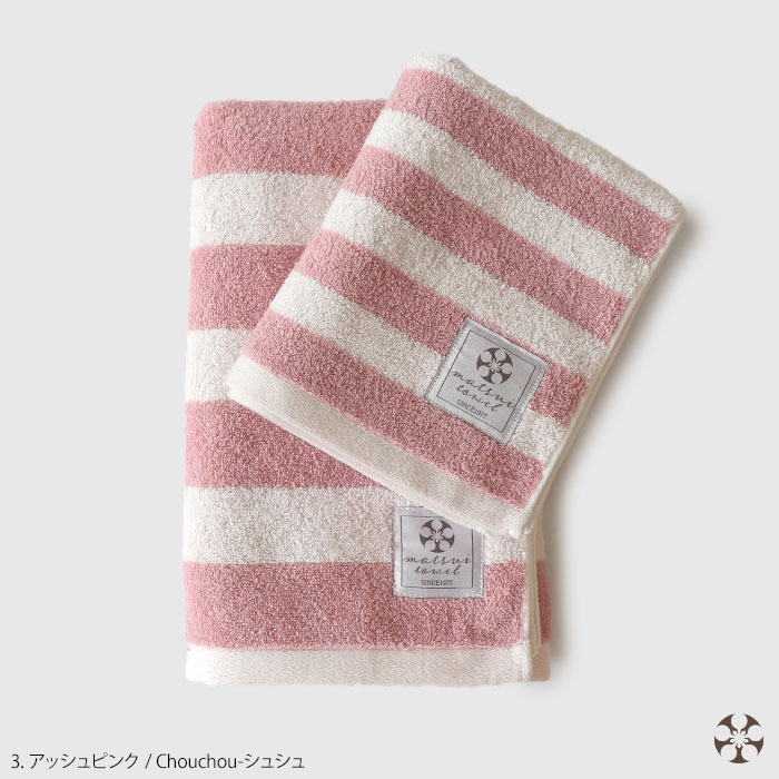 大口注文・法人のお問い合わせはこちら落ち着いた色合いのボーダー柄で、老若男女を問わず使って頂けるのが魅力です。 また、どんなインテリアにも調和してくれるから、キッチンや洗面所などでも大活躍! 何気ない毎日が、ちょっと楽しくなる、そんなボーダータオルです。 「Chou chouシュシュ」には、綿そのものの柔らかさとボリュームをアップさせる「エコモイスチャーミンク加工」が施されています。 だから、手触りは、驚くほどふんわりと滑らか。いつまでも「モフモフしていたい」気持ち良さです。 糸の風合いを損ねずにボーダー柄を表現できる、毛違いジャカード織という技法を採用しております。 ジャカード織の特徴は、裏側にも反転した柄が現れる事。 そのため、表と裏の両面できれいなボーダー柄が楽しめるのです。 ボーダー柄をとことん楽しんでいきたい。 そんな思いを形にした、マツイタオルです。タオルの裏面には、今治タオルの認定マークがしっかりと。 四国タオル工業組合が定める、独自の品質基準をクリアしたという高品質の証(認定番号:第2019-932号)です。
