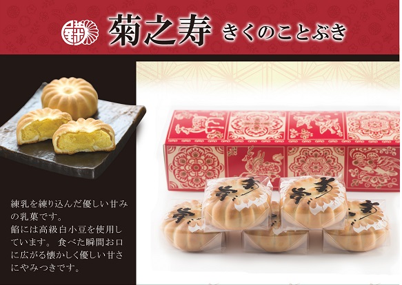 大口注文・法人のお問い合わせはこちら菊之寿(きくのことぶき)は、黄身餡洋風焼き菓子です。 ホクホクとした黄身餡と、練乳入りのソフトクッキーのような柔らかい洋風生地とのバランスが絶妙。 発売から60年近くになる人気商品です。 JALファーストクラスに採用されました。