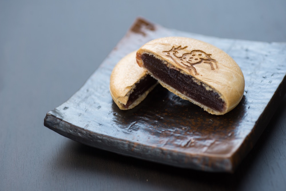 鹿の焼印を施した漉し餡の最中です。 餡を炊く釜は、今では珍しい砲金釜(大砲の素材に使用された合金で出来た丈夫で熱伝導率の良い釜)を使用し、高温の蒸気で一気に炊き上げることで手返しが少なくて済み、あっさりとした上品な餡が炊けます。