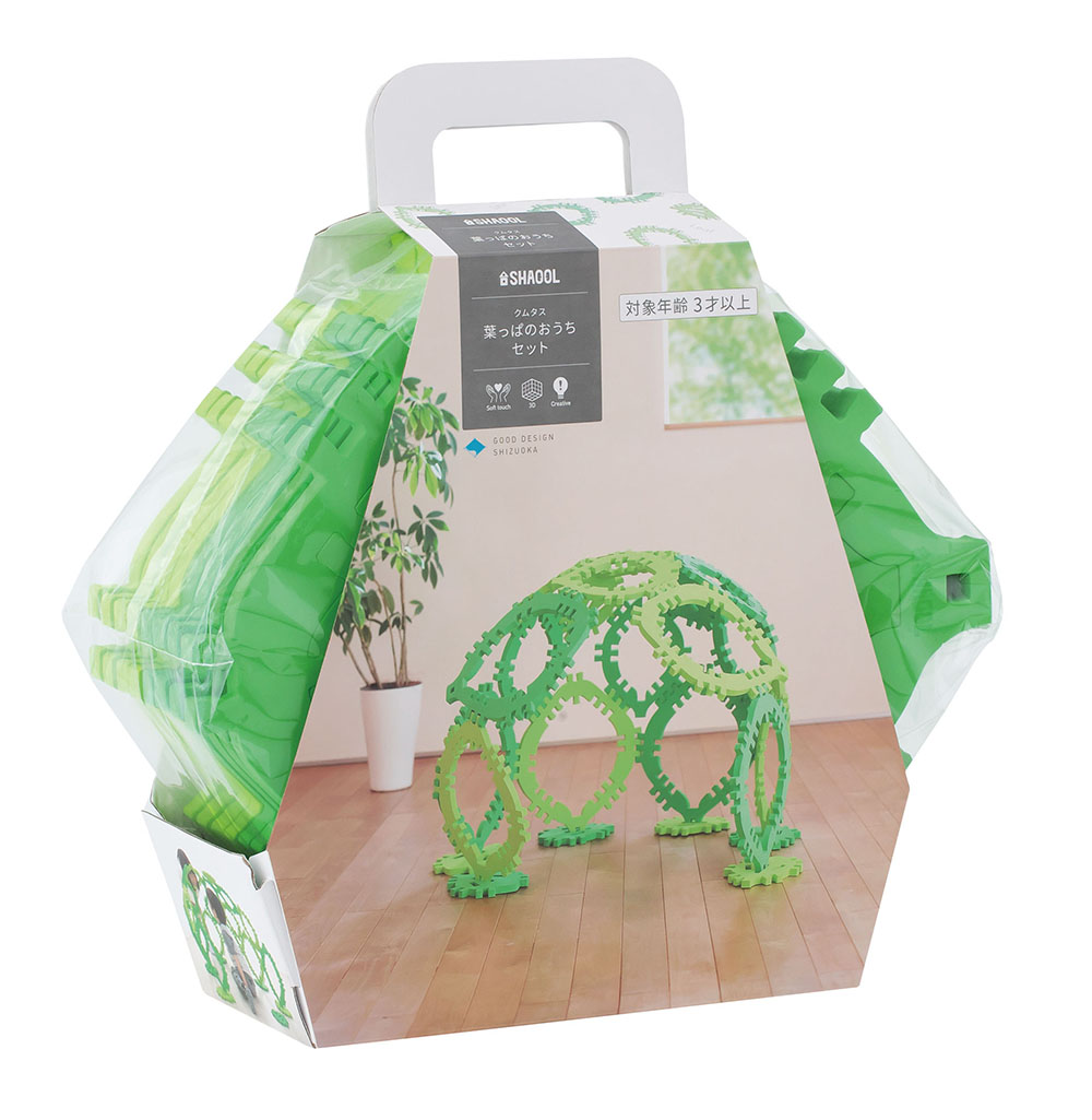 葉っぱの形を模したオリジナルデザイン。 緑と黄緑の2色を使っていて、 室内の家具やインテリアとも調和できて明るい部屋になります。 大1枚からバラバラにして3枚になり、 全てをバラバラにすると合計で24pcsになります。 全部で大8枚だけなので保管や片付けも省スペースだけですみます。 他のクムタスシリーズと組み合わせて遊ぶこともできます。