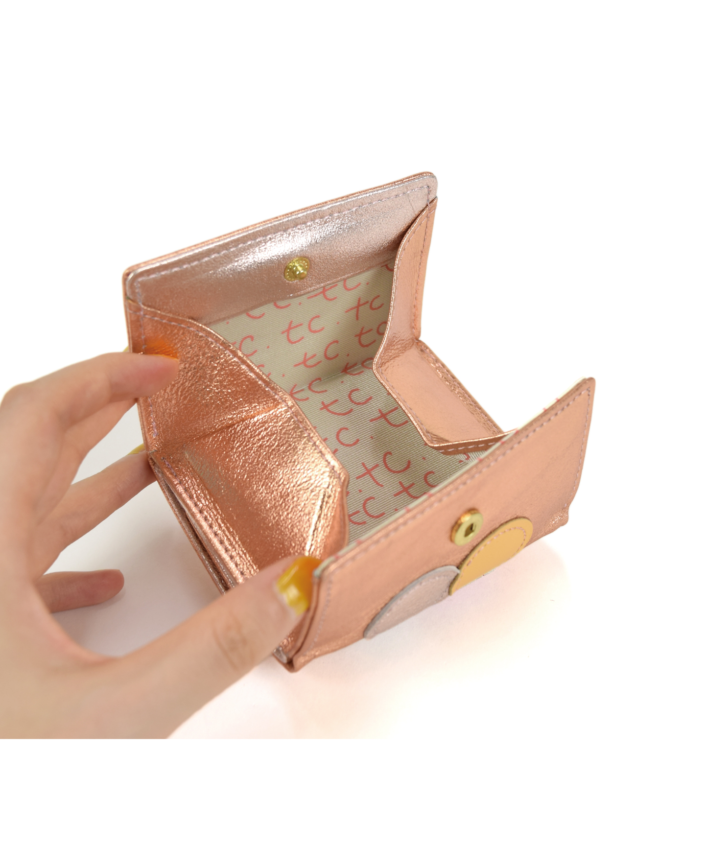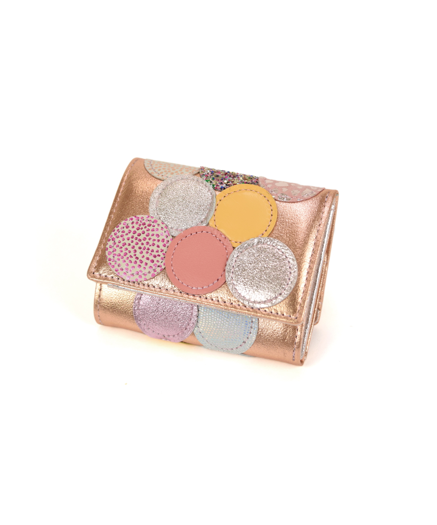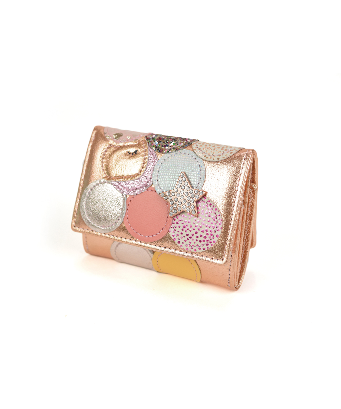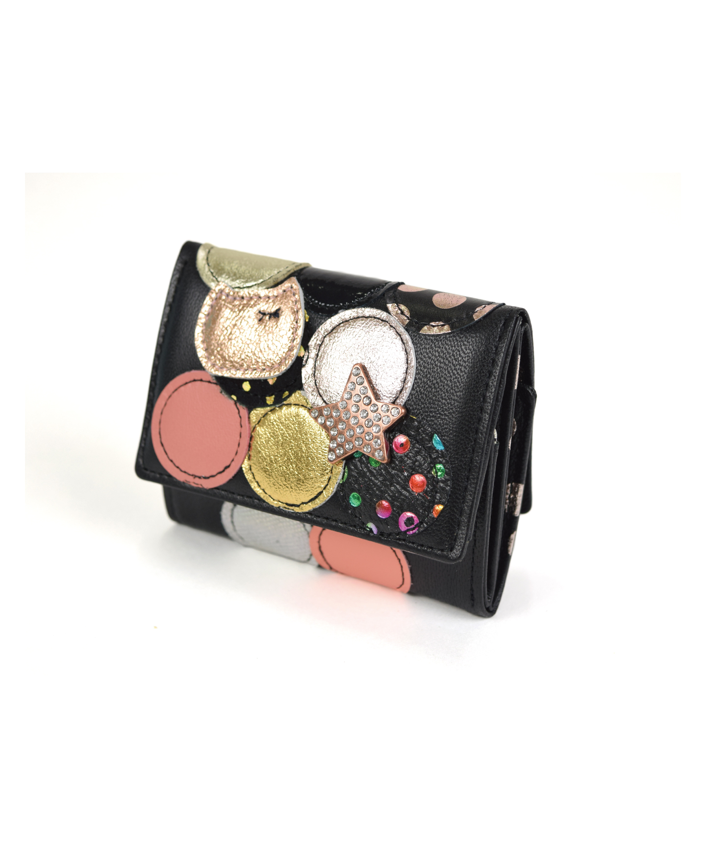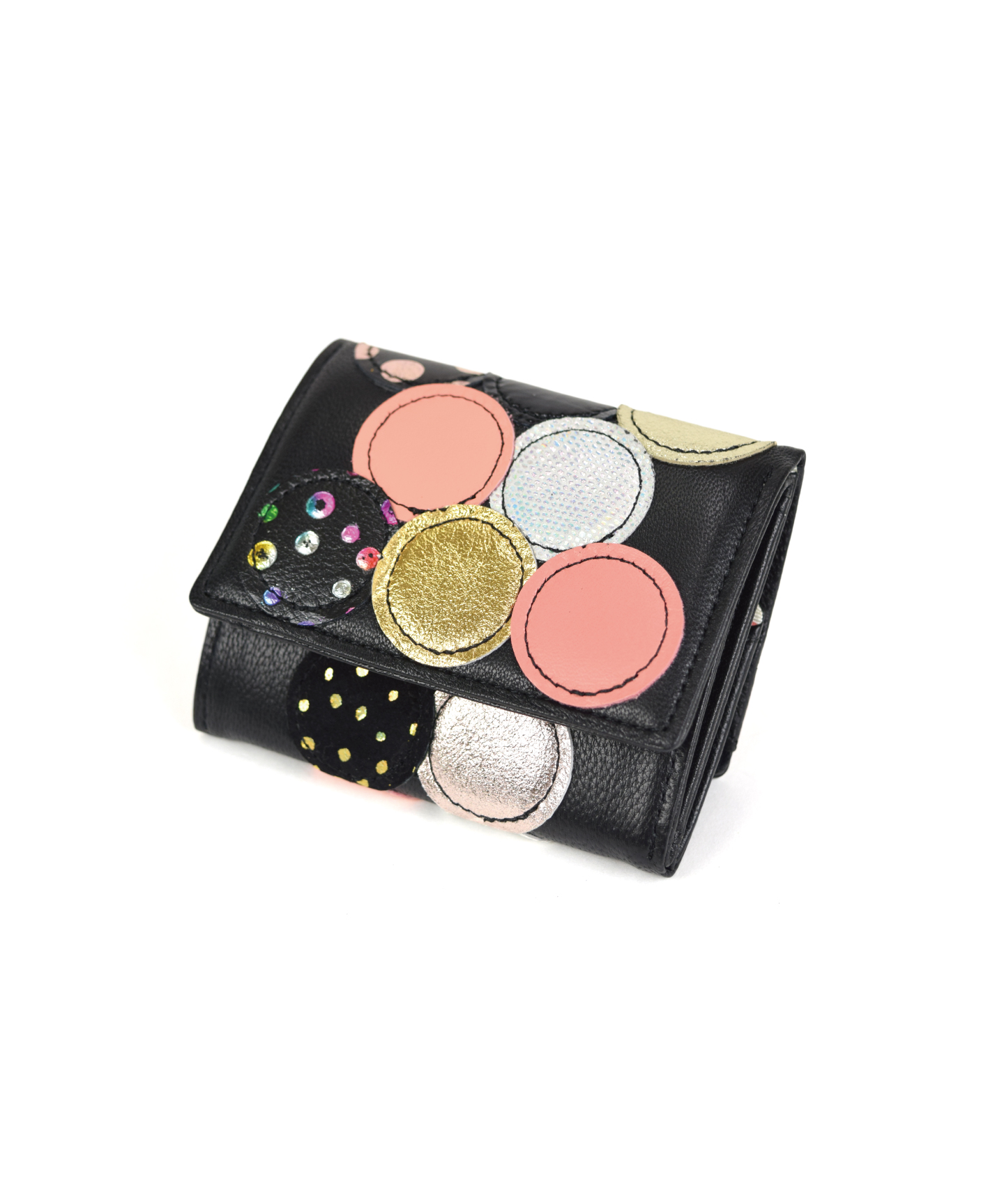 エナメル、ドットプリントなどさまざま素材の革を丸く型どり、パッチワークした三つ折り財布です。パッチワークのひとつが、ウインクしたネコに。星型のビジューもポイントになり、華やかでキラキラな、とびきり可愛らしいデザインです。プレゼントにもおすすめ!