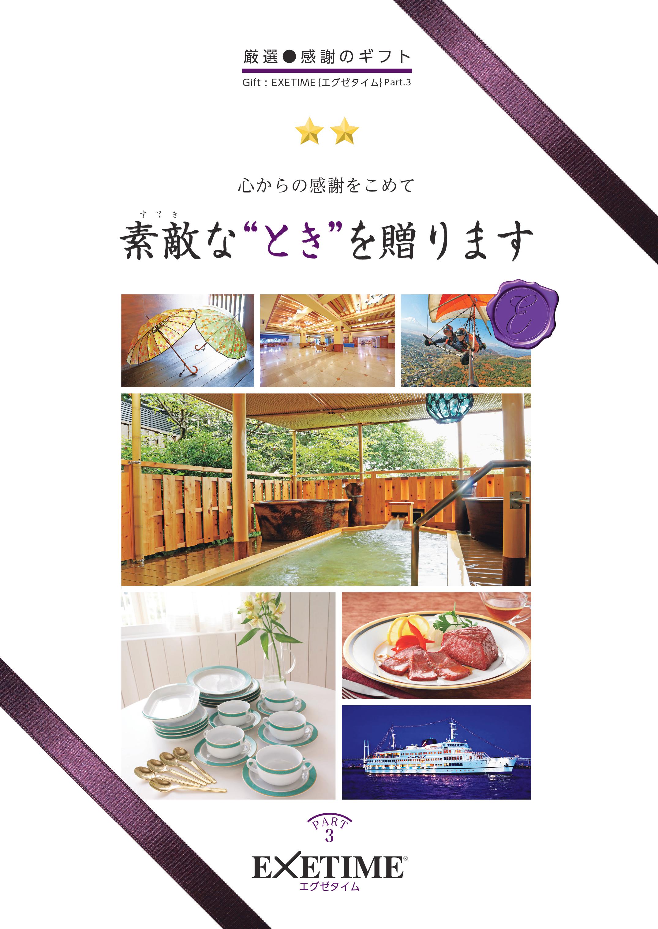 [こだわりのお宿・ホテルで上質な旅を贈る 温泉旅行カタログギフト] 【EXETIME】は、厳選した老舗旅館や有名ホテルを掲載した旅行カタログギフトです。 お宿は全国各地の405施設からお選びいただけます。 その他、行ってみたかった温泉、憧れのゴルフ場、高級エステや冒険心をくすぐるアウトドアなど、、 思いでや感動を紡ぐ体験型商品と、選りすぐりの品々豊富なラインナップでご用意いたしました。 今までにないカタログギフトの形を実現し、雑誌やガイドブックのような、丁寧な紹介記事で、見る・読む・選ぶ楽しみも拡大。新しいギフトの楽しさをお届けします。 大切な人に「寛ぎのとき」をお届けする旅行ギフトにご活用下さい。