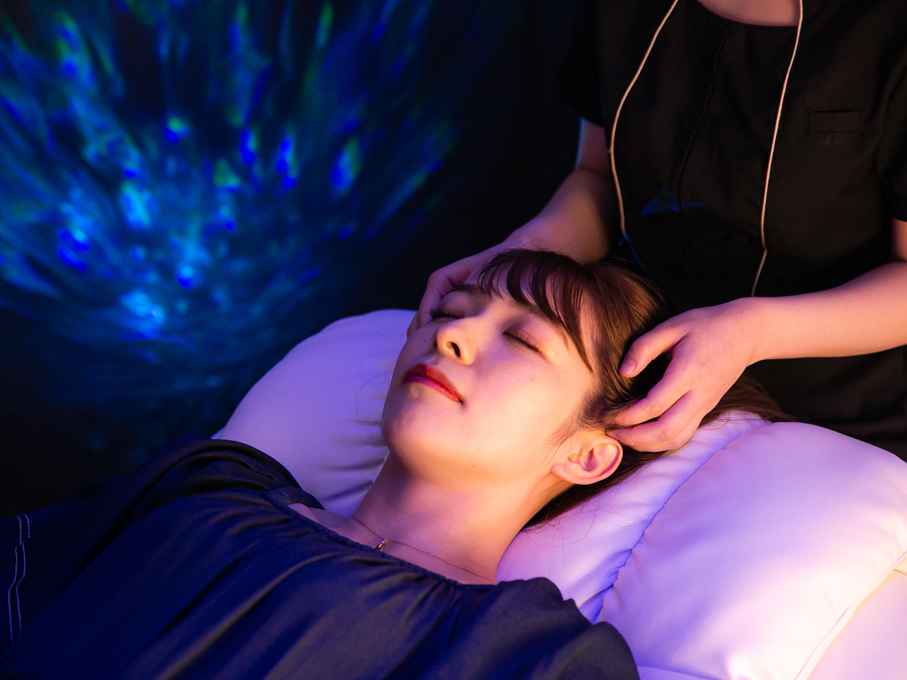プラネタリウムの中で星空に囲まれながら、ドライヘッドスパを受けられるコースです。水やオイルを一切使わず、繊細な手技で頭皮と髪にやさしくアプローチ。心地よい刺激を与えながらリフレッシュを促します。