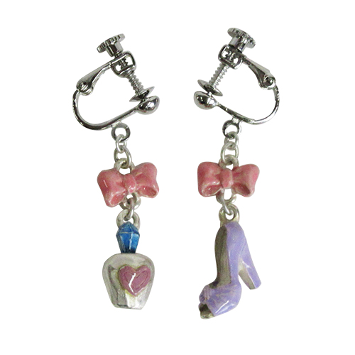 左右異なるヒールと香水瓶の形のイヤリング。 リボン付きでとてもガーリーです。