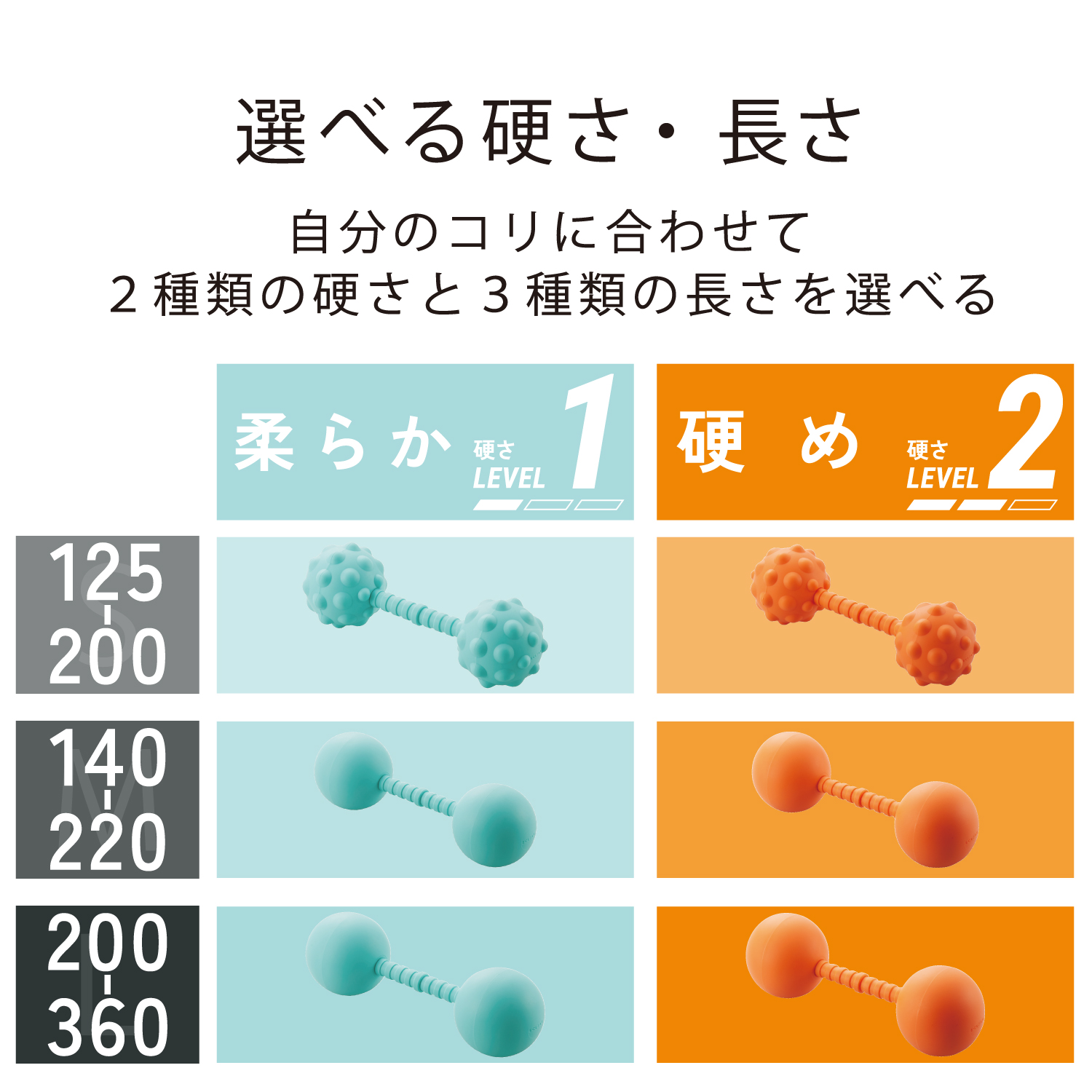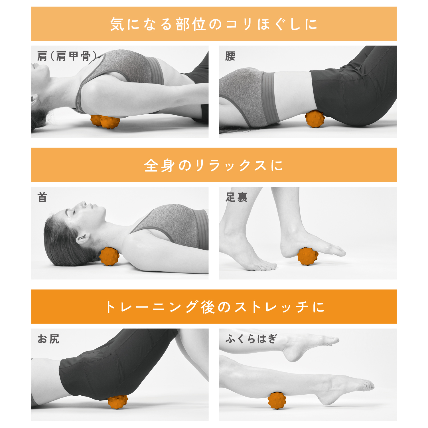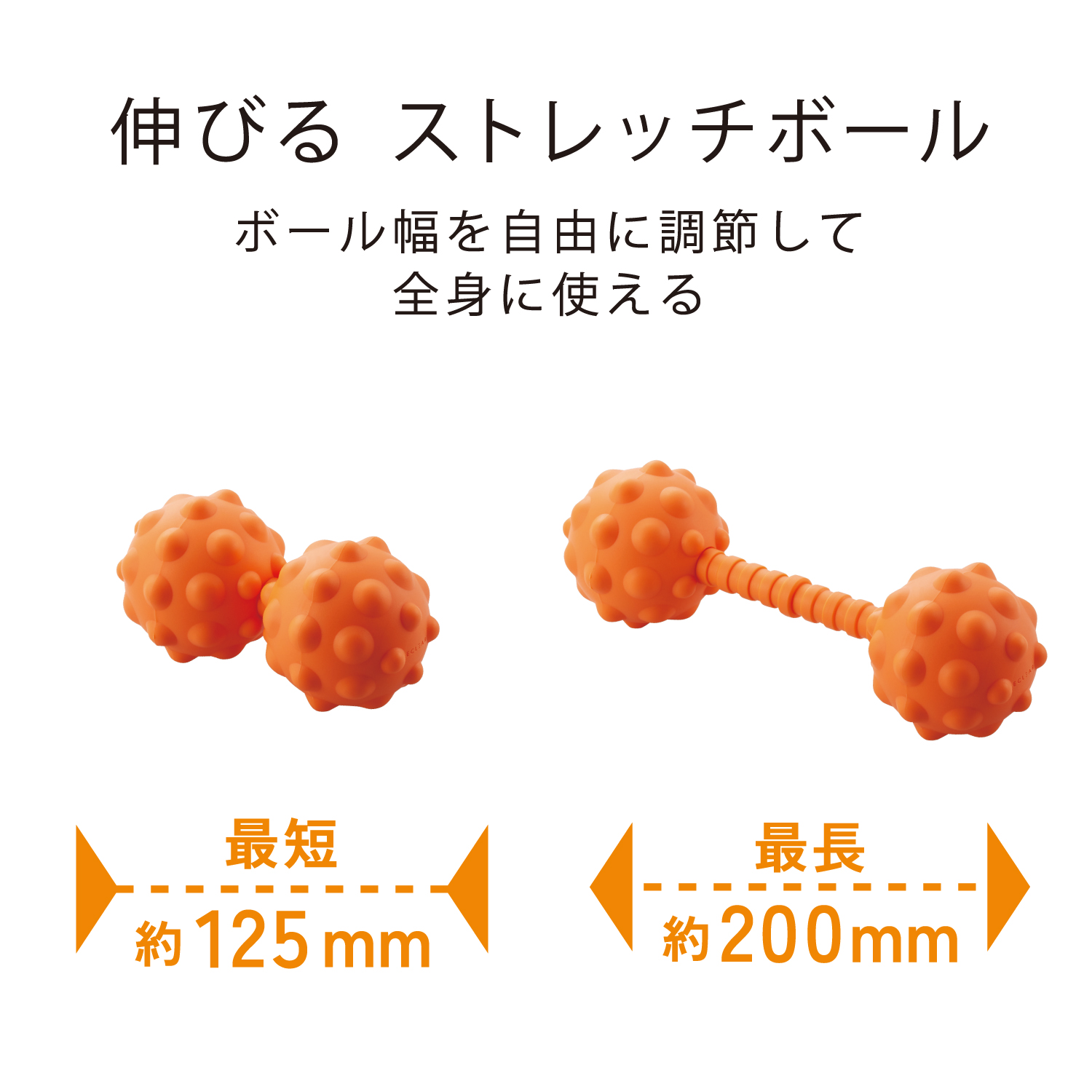 大口注文・法人のお問い合わせはこちら気になる部位にしっかり届きます。寝ながら、座りながらコリをほぐすレギュラーサイズの伸びるストレッチボール(凸タイプ)です。 体の部位に合わせてボール幅を最短約125mmから最長約200mm(突起部のぞく)の間で調節可能です。 しっかり全身のコリをほぐすハードタイプです。 コンパクトな直径約60mm(突起部のぞく)のボール2個サイズです。
