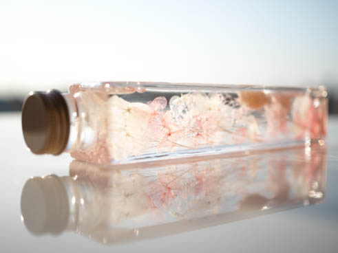 容器の中に満たされている液体は、ハーバリウム専用の特殊なオイル。この中にドライフラワーやプリザーブドフラワーを漬け込むことで、その美しい色合いを約1年ほど保つことができます◎瓶を優しく振ると、中のお花もゆらゆら…。