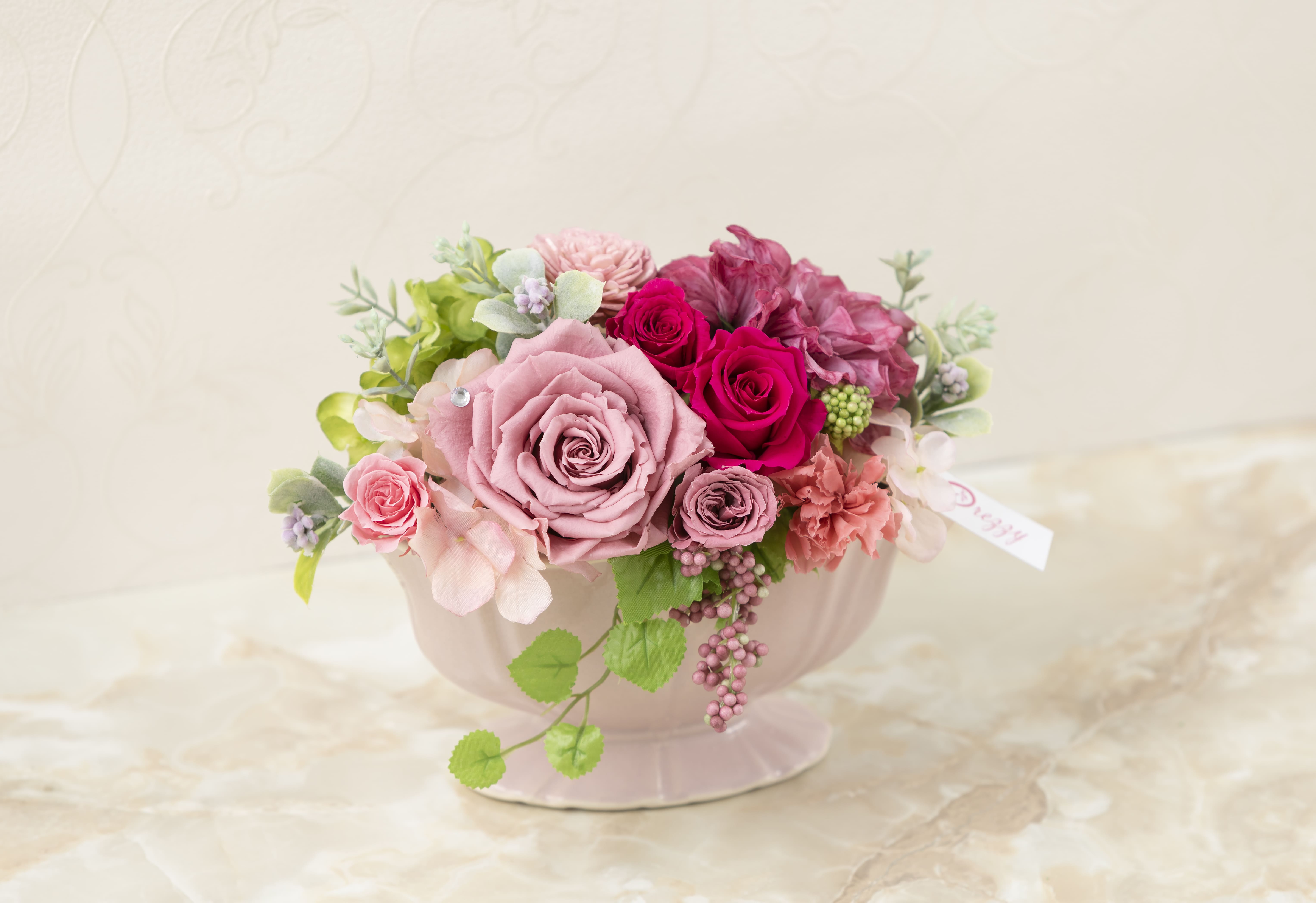 大口注文・法人のお問い合わせはこちら<とても華やか!大輪のバラに想いを込めて> 上品なピンク色の陶器には、5種類のバラを中心に大小さまざまなお花が咲いていて、まるでバラ園のような華やかさです。 ひときわ華やかな大輪のプリザーブドフラワーのバラには、イミテーションストーンがあしらわれていて、光のあたる角度によってキラッと輝く様子も楽しめます。