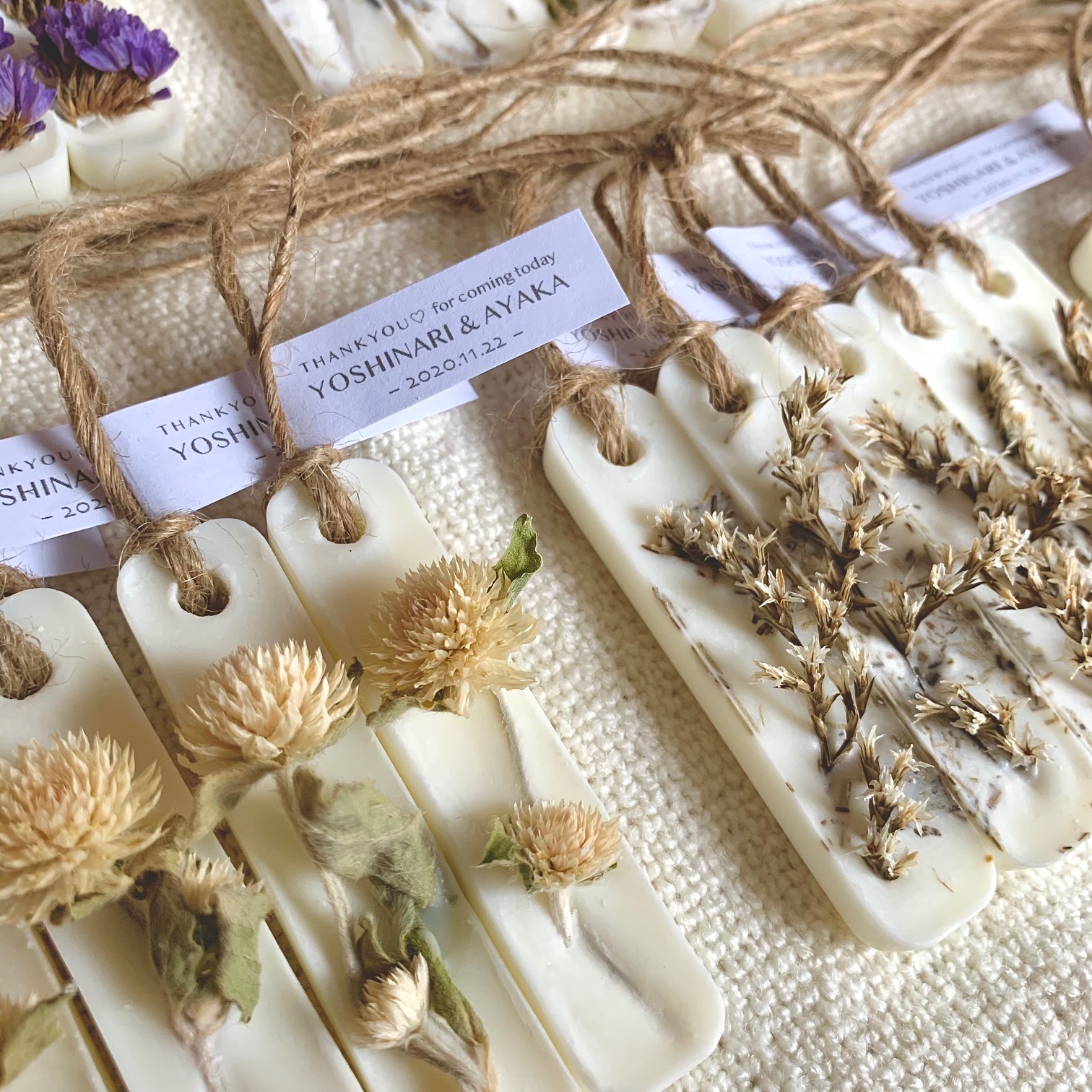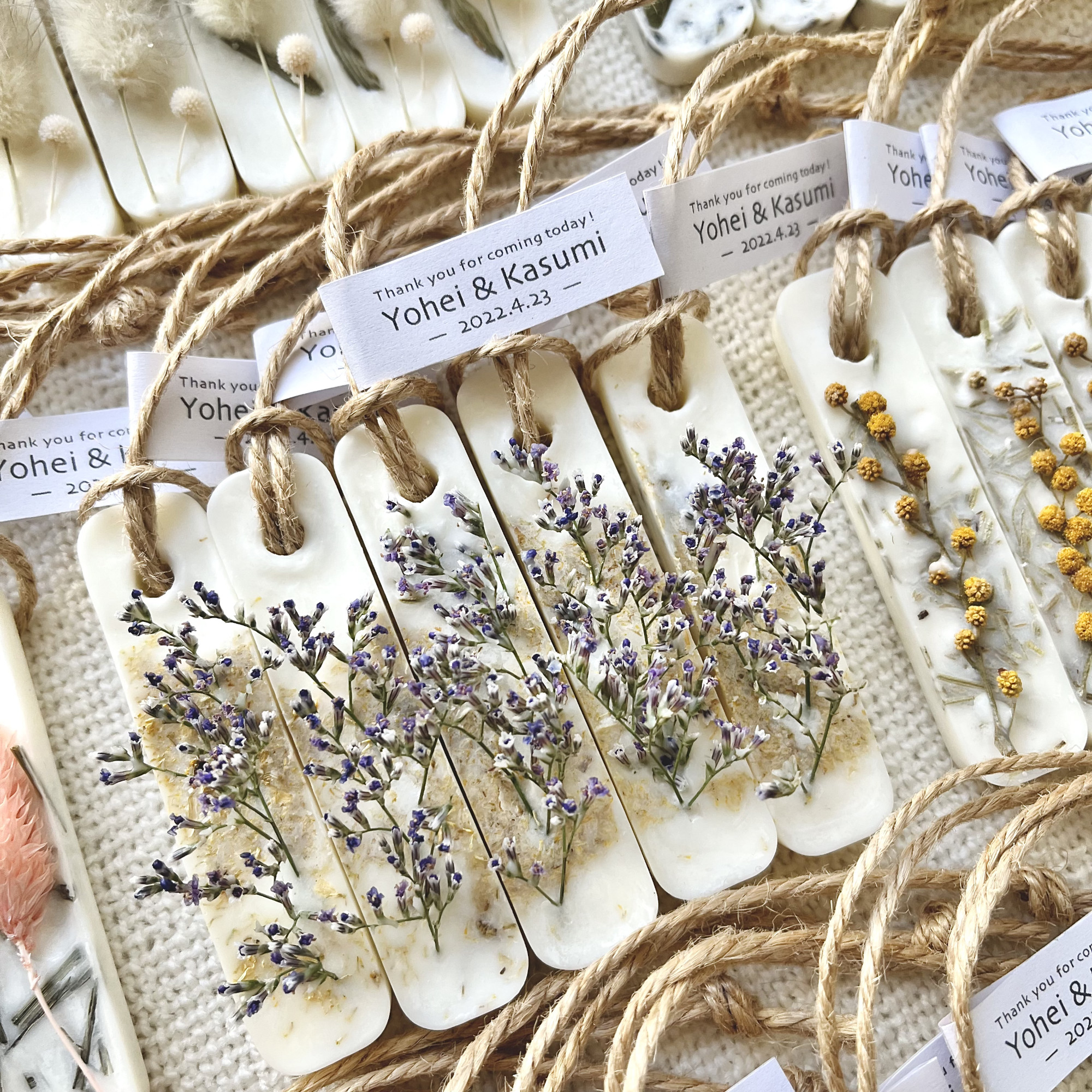 大口注文・法人のお問い合わせはこちらソイワックスとミツロウワックス(蝋)の中に香りとお花を詰め込んだminiサイズ10個setの《アロマワックスサシェ》 アロマワックスサシェとは、アロマの香りと本物の花(ドライフラワー)をコラージュしたおしゃれなフレグランスアイテムです。 ノベルティやプチギフト、ウェディングギフトや内祝いなど、感謝の気持ちを伝えたい大切な人へ10個単位でご用意しました。 ※オプションでオリジナルのネームが作成できます。お名前や誕生日、メッセージが入ったプレゼントは忘れることのできない特別なプレゼントに♡ ※ブランドネームの白いタグ部分です。 ユーカリ、ラベンダー、ラグラス、スターチス、アローグラス、タタリカ、千日紅など数十種類あるドライフラワーからランダムにバランスをみてコラージュします。 花(ドライフラワー)の選定からすべて手作業で行っているため同じものはひとつとない、"あなただけのアロマワックスサシェ"になります。