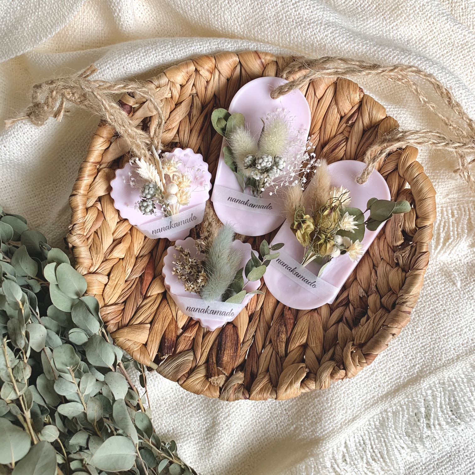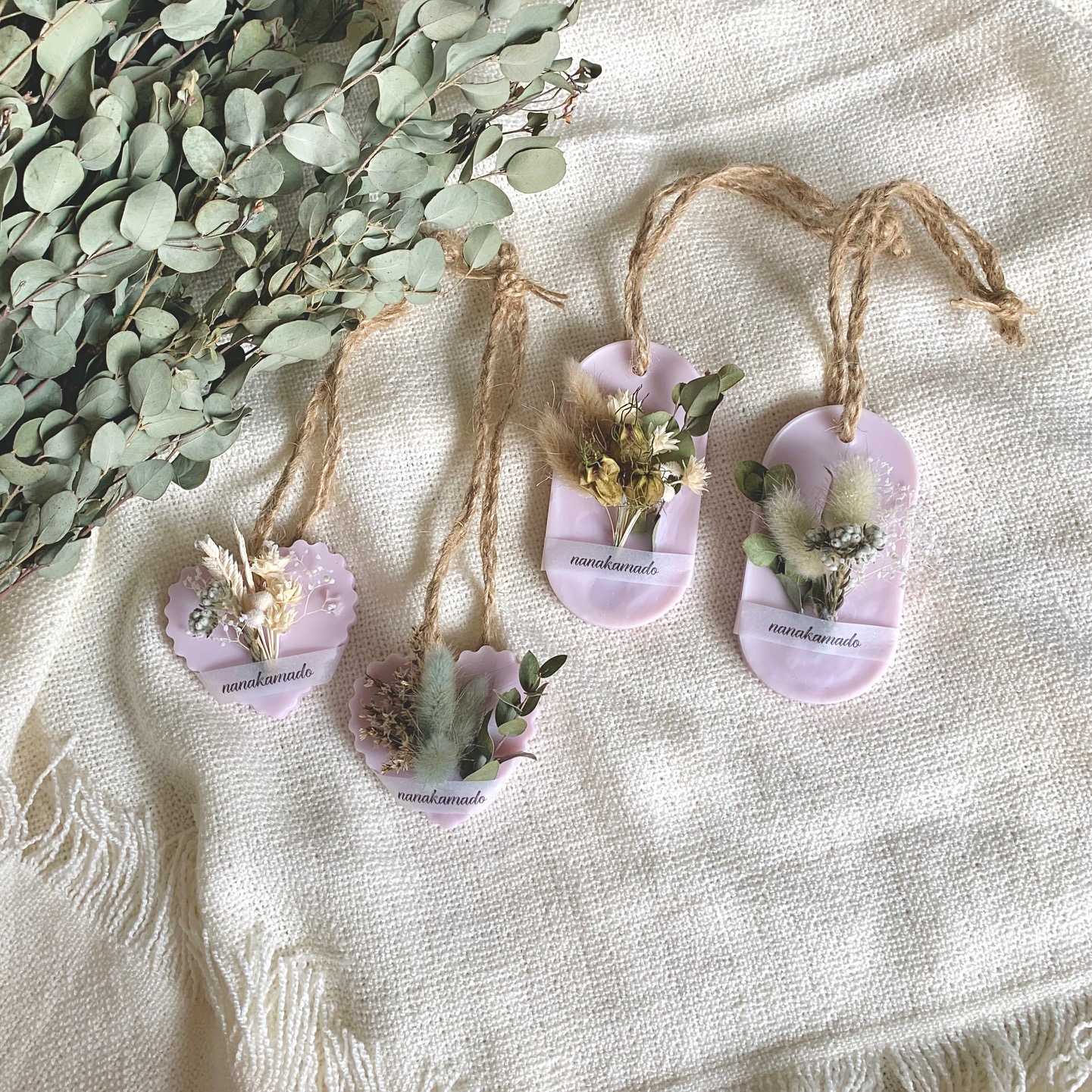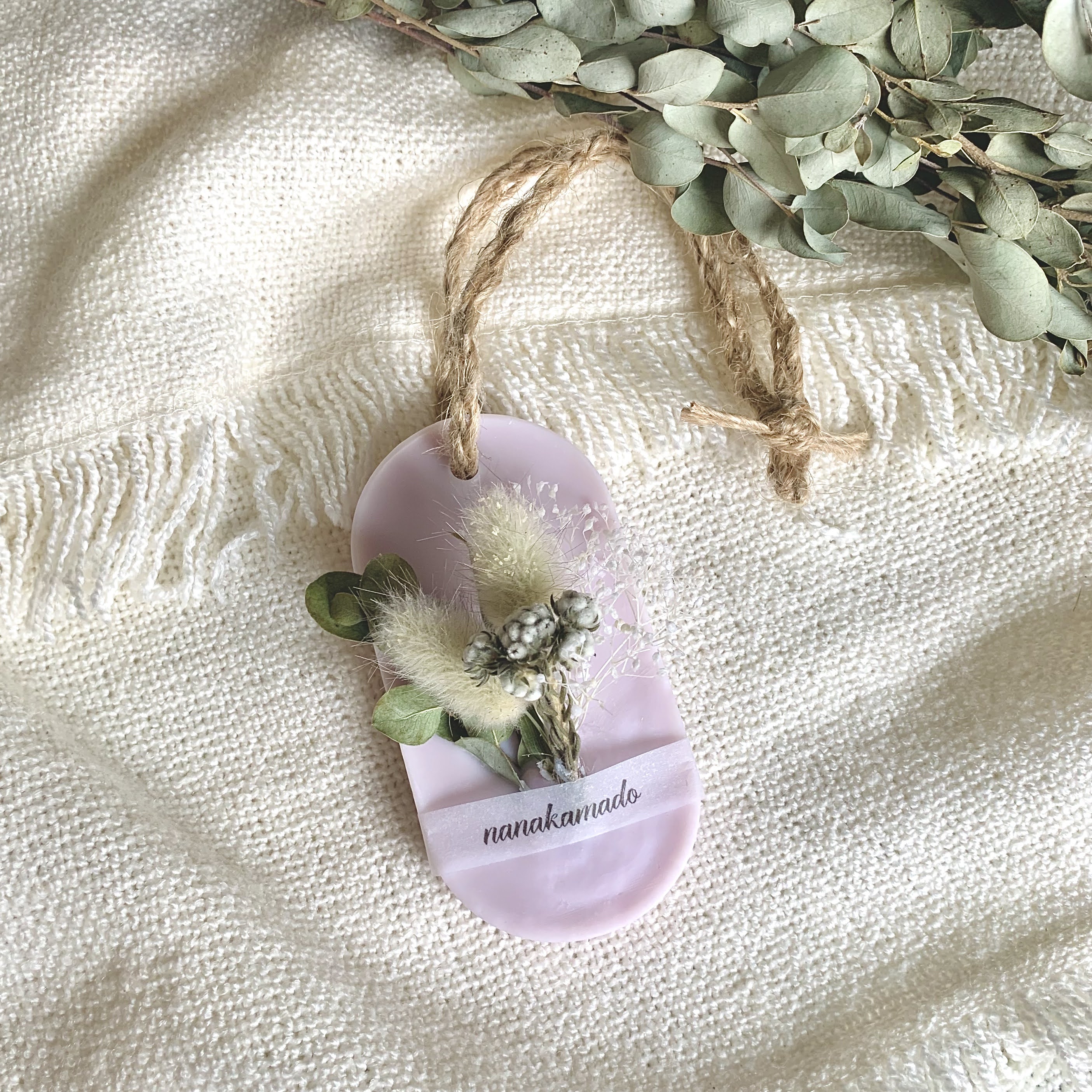 大口注文・法人のお問い合わせはこちらソイワックスとミツロウワックス(蝋)の中に香りとお花を詰め込んだ、オーバル型の《アロマワックスサシェ》 アロマワックスサシェとは、アロマの香りと本物の花(ドライフラワー)を、コラージュしたおしゃれなフレグランスアイテムです。 花(ドライフラワー)の選定からすべて手作業で行っているため、同じものはひとつとない、"あなただけのアロマワックスサシェ"になります。 優しいパープルベースの色目で華やかな雰囲気に。 ユーカリやラグラス、ワイルドコットンフラワーetcのドライをコラージュしました。 自然の香りと花のある心地よいライフスタイルを気軽に楽しめます。 火を使用せず自然に香るので、小さなお子様がいるご家庭でも安心して香りを楽しめます。 玄関、トイレ、クローゼットなどに置いたり掛けたり、優しいアロマの香りをお楽しみください。 インテリアとしてドアノブや壁に掛けるのもオススメです。 自分へのご褒美はもちろん、お誕生日プレゼント、結婚お祝いや出産お祝い、内祝いなど、感謝の気持ちを伝えたい大切な人へプレゼントとしてもオススメです。