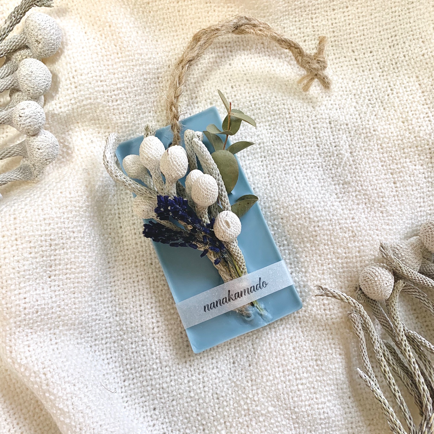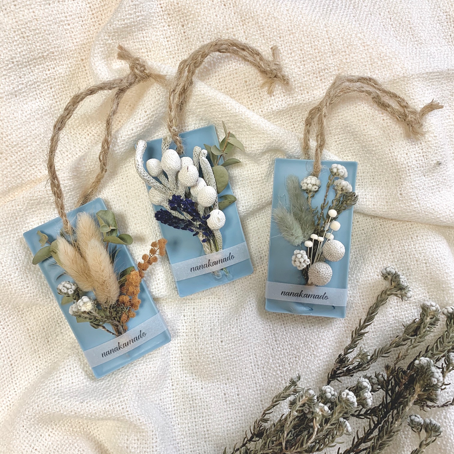 大口注文・法人のお問い合わせはこちらソイワックスとミツロウワックス(蝋)の中に香りとお花を詰め込んだ、レクタングル型の《アロマワックスサシェ》 アロマワックスサシェとは、アロマの香りと本物の花(ドライフラワー)を、コラージュしたおしゃれなフレグランスアイテムです。 花(ドライフラワー)の選定からすべて手作業で行っているため、同じものはひとつとない、"あなただけのアロマワックスサシェ"になります。 グレイッシュブルーベースの色目でオシャレな雰囲気に。 ユーカリやシルバーブルニア、ムスカリのドライをコラージュしました。 自然の香りと花のある心地よいライフスタイルを気軽に楽しめます。 火を使用せず自然に香るので、小さなお子様がいるご家庭でも安心して香りを楽しめます。 玄関、トイレ、クローゼットなどに置いたり掛けたり、優しいアロマの香りをお楽しみください。 インテリアとしてドアノブや壁に掛けるのもオススメです。 自分へのご褒美はもちろん、お誕生日プレゼント、結婚お祝いや出産お祝い、内祝いなど、感謝の気持ちを伝えたい大切な人へプレゼントとしてもオススメです。