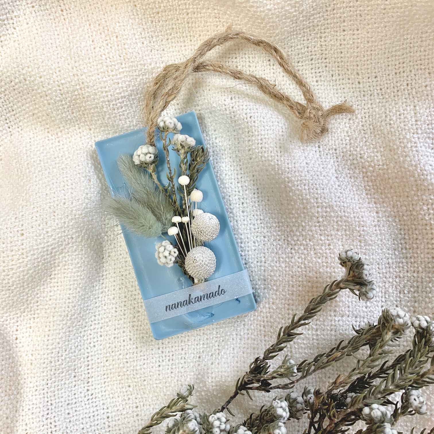 大口注文・法人のお問い合わせはこちらソイワックスとミツロウワックス(蝋)の中に香りとお花を詰め込んだ、レクタングル型の《アロマワックスサシェ》 アロマワックスサシェとは、アロマの香りと本物の花(ドライフラワー)を、コラージュしたおしゃれなフレグランスアイテムです。 お花(ドライフラワー)の選定からすべて手作業で行っているため、同じものはひとつとない、"あなただけのアロマワックスサシェ"になります。 グレイッシュブルーベースの色目でオシャレな雰囲気に。 ワイルドコットンフラワーやピンキーボタン、ラグラスやピンキーボタンのドライをコラージュしました。 自然の香りと花のある心地よいライフスタイルを気軽に楽しめます。 火を使用せず自然に香るので、小さなお子様がいるご家庭でも安心して香りを楽しめます。 玄関、トイレ、クローゼットなどに置いたり掛けたり、優しいアロマの香りをお楽しみください。 インテリアとしてドアノブや壁に掛けるのもオススメです。 自分へのご褒美はもちろん、お誕生日プレゼント、結婚お祝いや出産お祝い、内祝いなど、感謝の気持ちを伝えたい大切な人へプレゼントとしてもオススメです。