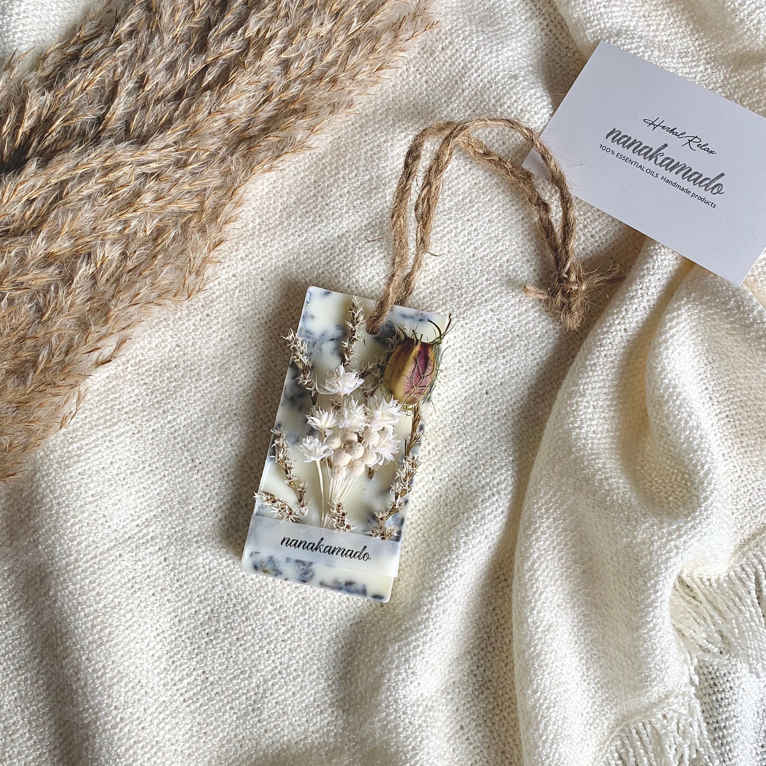 大口注文・法人のお問い合わせはこちらソイワックスとミツロウワックス(蝋)の中に香りとお花を詰め込んだ、レクタングル型の《アロマワックスサシェ》 アロマワックスサシェとは、アロマの香りと本物の花(ドライフラワー)を、コラージュしたおしゃれなフレグランスアイテムです。 お花(ドライフラワー)の選定からすべて手作業で行っているため、同じものはひとつとない、"あなただけのアロマワックスサシェ"になります。 タタリカやミニコーンフラワー、フーセンポピーやピンキーボタン、ラベンダーのドライをコラージュしました。 自然の香りと花のある心地よいライフスタイルを気軽に楽しめます。 火を使用せず自然に香るので、小さなお子様がいるご家庭でも安心して香りを楽しめます。 玄関、トイレ、クローゼットなどに置いたり掛けたり、優しいアロマの香りをお楽しみください。 インテリアとしてドアノブや壁に掛けるのもオススメです。 自分へのご褒美はもちろん、お誕生日プレゼント、結婚お祝いや出産お祝い、内祝いなど、感謝の気持ちを伝えたい大切な人へプレゼントとしてもオススメです。