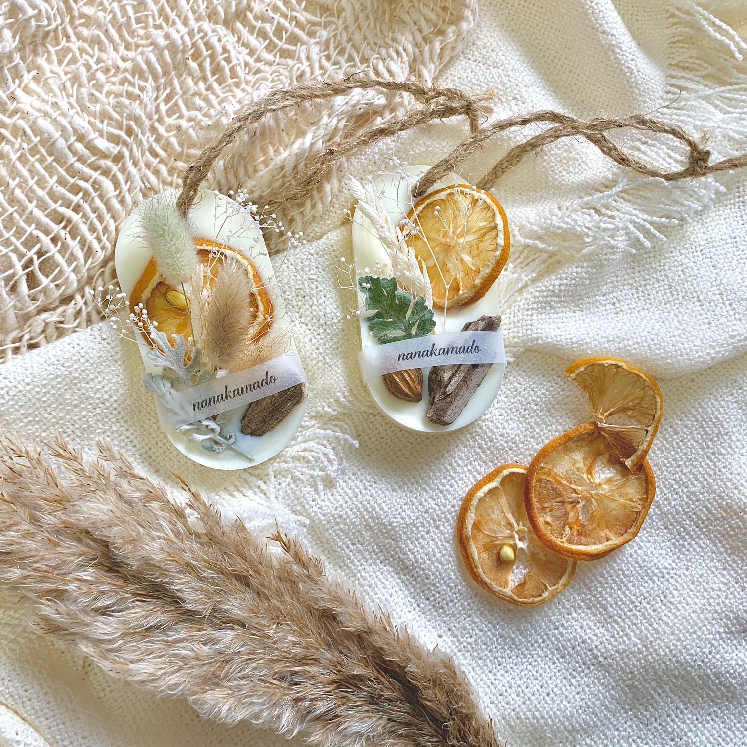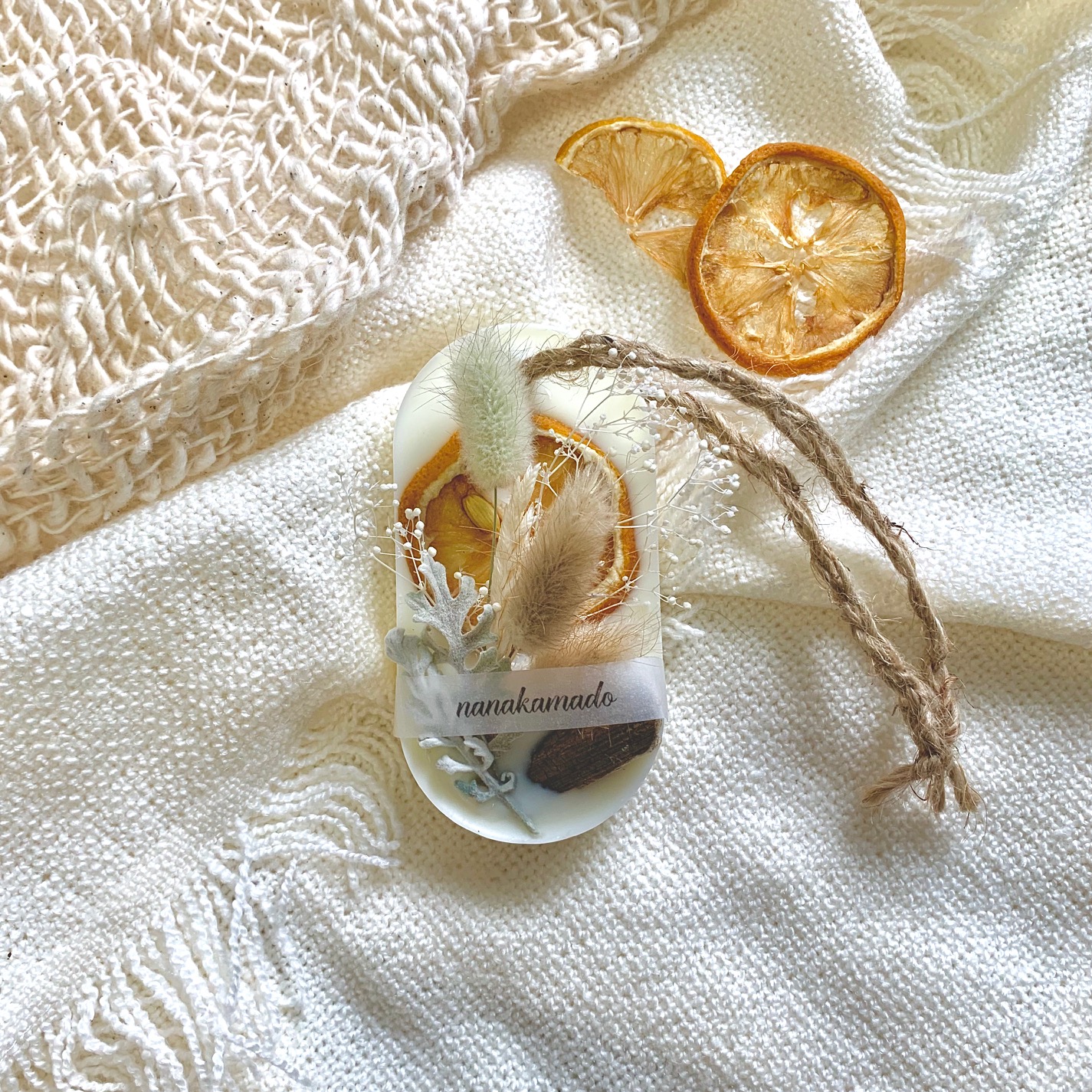 大口注文・法人のお問い合わせはこちらソイワックスとミツロウワックス(蝋)の中に香りとお花を詰め込んだ、オーバル型の《アロマワックスサシェ》 アロマワックスサシェとは、アロマの香りと本物の花(ドライフラワー)を、コラージュしたおしゃれなフレグランスアイテムです。 お花(ドライフラワー)の選定からすべて手作業で行っているため、同じものはひとつとない、"あなただけのアロマワックスサシェ"になります。 優しいクリームイエローベースの色目でほっこりな雰囲気に。 ドライレモンやラグラス、シロタエギクやアローグラスetcのドライと流木をコラージュしました。 自然の香りと花のある心地よいライフスタイルを気軽に楽しめます。 火を使用せず自然に香るので、小さなお子様がいるご家庭でも安心して香りを楽しめます。 玄関、トイレ、クローゼットなどに置いたり掛けたり、優しいアロマの香りをお楽しみください。 インテリアとしてドアノブや壁に掛けるのもオススメです。 自分へのご褒美はもちろん、お誕生日プレゼント、結婚お祝いや出産お祝い、内祝いなど、感謝の気持ちを伝えたい大切な人へプレゼントとしてもオススメです。