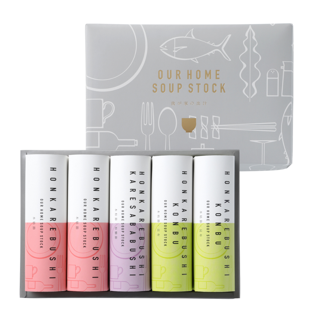 お洒落なBOOK型のパッケージに、化学調味料無添加、食塩、人工調味料不使用で、本枯節の旨味を活かした3種類のだしパックを詰め合わせました。
