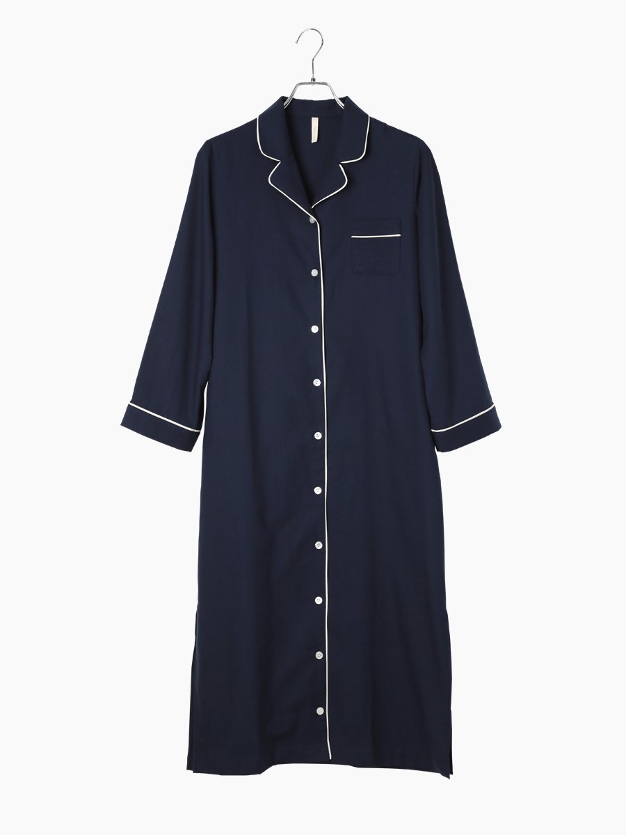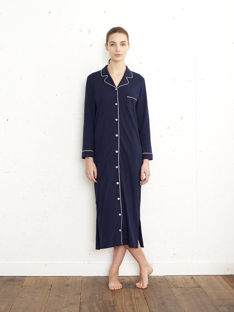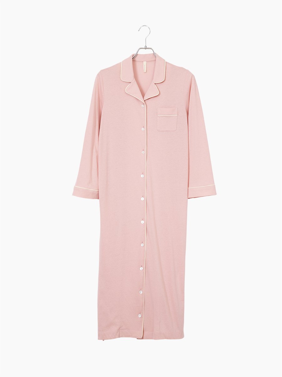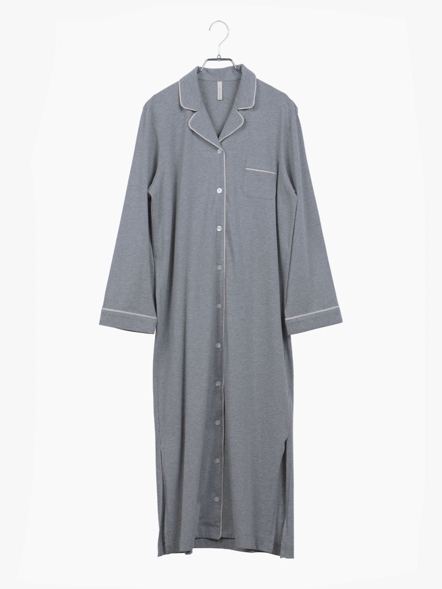 大口注文・法人のお問い合わせはこちらシンプルで上品なフルレングスのスリーピングローブです。 ふんわりと編み立てられたオーガニックコットンがほどよく空気を含み、全身をやわらかく包みます。 襟ぐりやカフスにあしらったディテールのパイピングが上品な印象です。 前のボタンを開けて、ロングカーディガンのように羽織ったり、ベルトをしてシャツドレスのように装うスタイルも、スリーピングウェア、ルームウェアなど 幅広いコーディネートが楽しめるオススメアイテムです。 オーガニックコットンを着て眠る幸せを、ぜひ体験してみてください。
