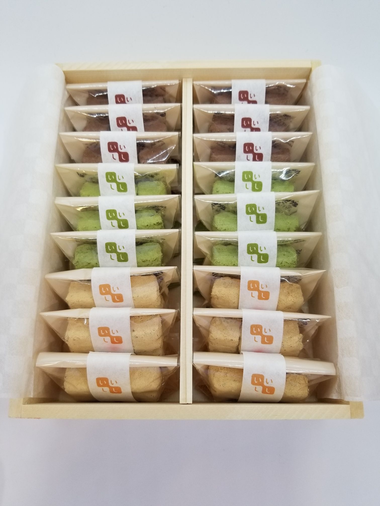 大口注文・法人のお問い合わせはこちらほのかなキャラメル風味の、お米とアーモンドを使ったサイコロ状の生地に、抹茶・きなこ・ココアをまぶしました。 3種類の味を3袋ずつ高級感のある木箱に入れて提供しております。 サクッとした食感と、口の中に広がる香ばしいお米の風味と、抹茶・きなこ・ココアとのマッチングをお楽しみください。