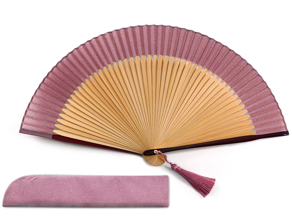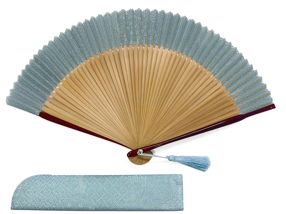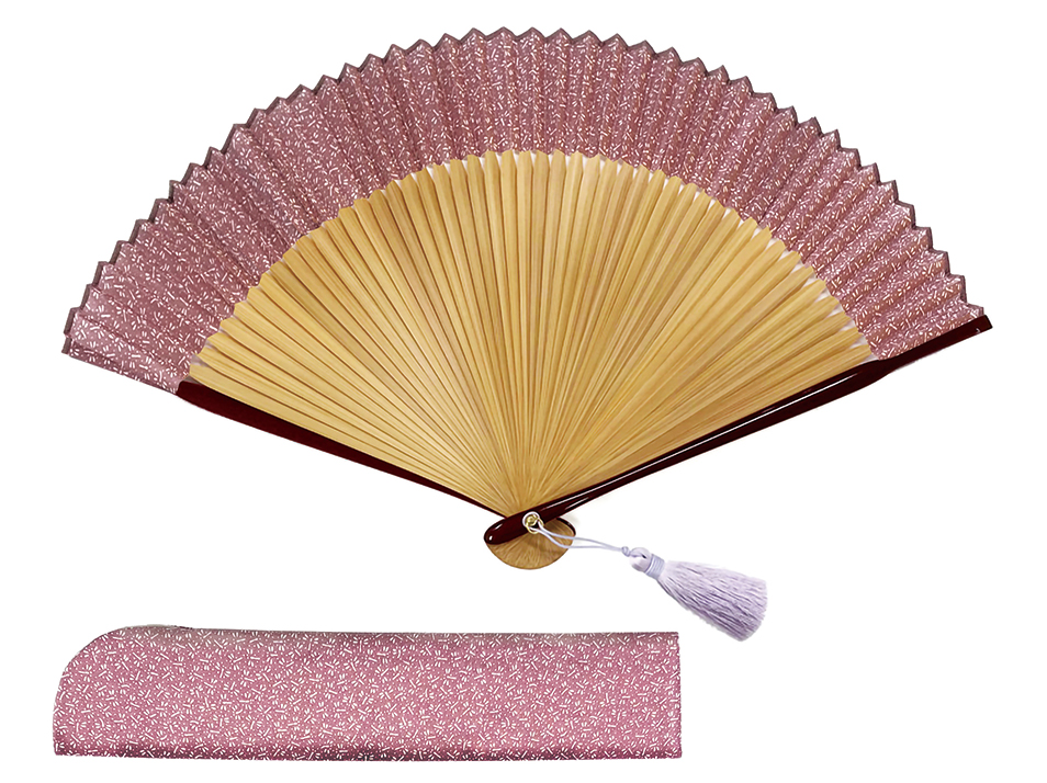 親骨と極めて薄く削り出した中骨をあわせて50本の竹がしなり、優しい風をおこします。 扇子袋も扇子と共生地の薄絹の江戸小紋で作りました。