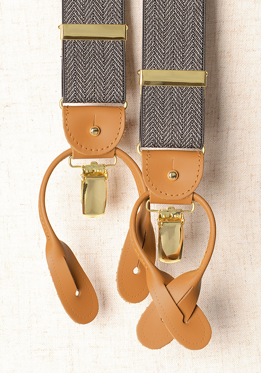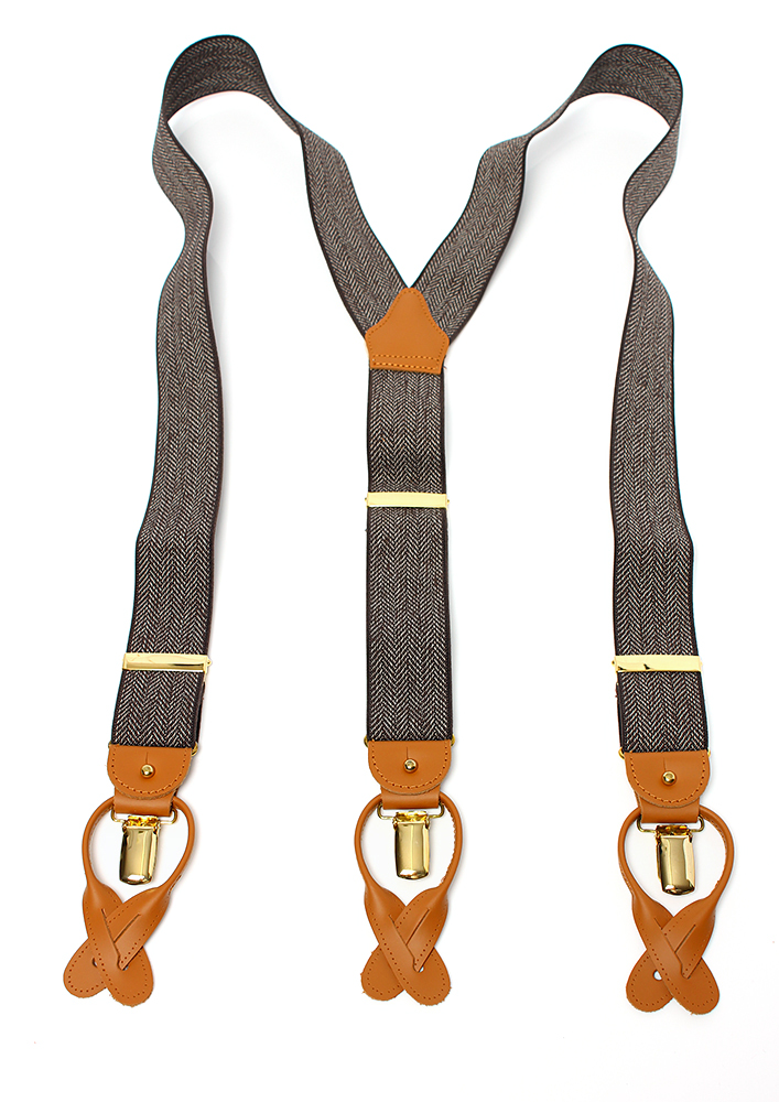 大口注文・法人のお問い合わせはこちらブラック 無地はシンプルな黒無地のサスペンダーなのでフォーマル用にもビジネス用にもお使い頂けます。1本あると便利なとても使い勝手のいいサスペンダーです。 ブラウン ヘリンボーンは渋みのある色みがエレガントなサスペンダーです。 ブラウンのスーツに合わせてもいいですが、茶系のツイードと合わせると、英国紳士の雰囲気でかっこいいよく、カジュアルにデニムとも相性が良いです。 背中(後ろ)はY型のスタイルとなり、クリップ、吊革がご使用いただける2in1の仕様で大変便利です。