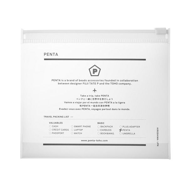 旅のお供にPENTAを連れて行って、旅先でお洒落を楽しんでほしいという願いから、 パッケージにも拘り、飛行機の絵が入り、 持ち物チェックリストに【PENTA(ペンタ)】の項目もプリントしている遊び心のあるパッケージとなっています。 また、パッケージ単体でも小物入れなどにも使え、アクセサリーだけ旅立つのではなく、パッケージも含めて楽しめるジュエリーブランドです。