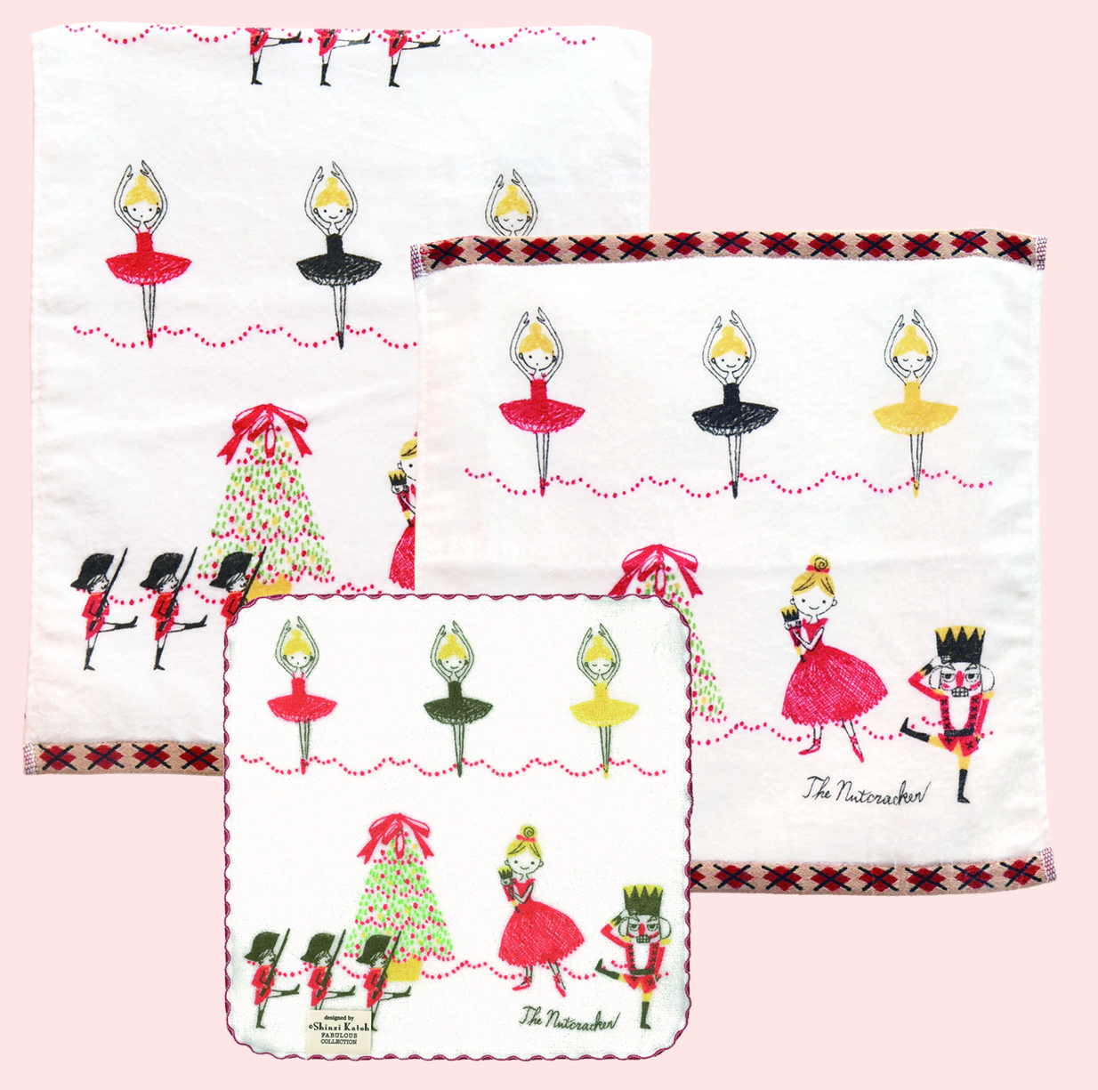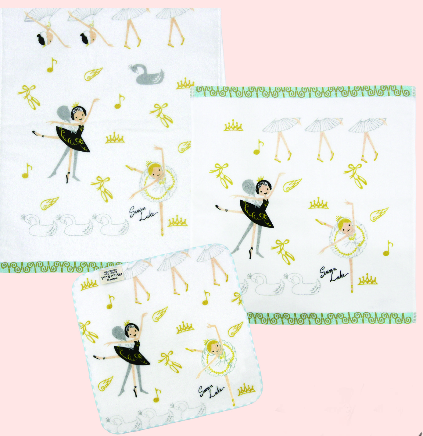 有名なバレエの演目を題材にしたシャーリングのタオル。フェイスタオルとゲストタオル・タオルハンカチをセットにしました。