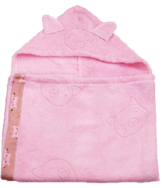 ピンクのフードバスタオルは豚さんです。 可愛いおミミがキュートです。ボーダーとバスタオルにも。かわいい豚さん柄。