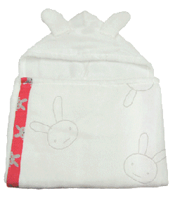 白いフードバスタオルはうさぎです。長いうさぎのミミがついています。 可愛いうさぎがあちこちに。ふわふわで柔らかいフードバスタオルです。
