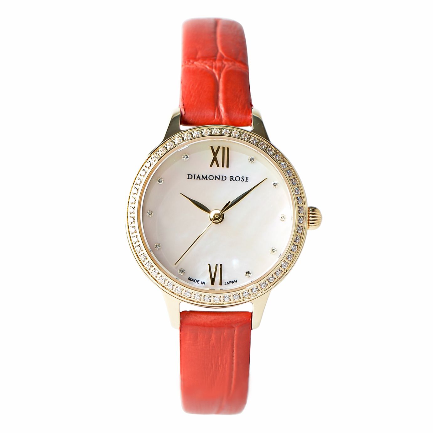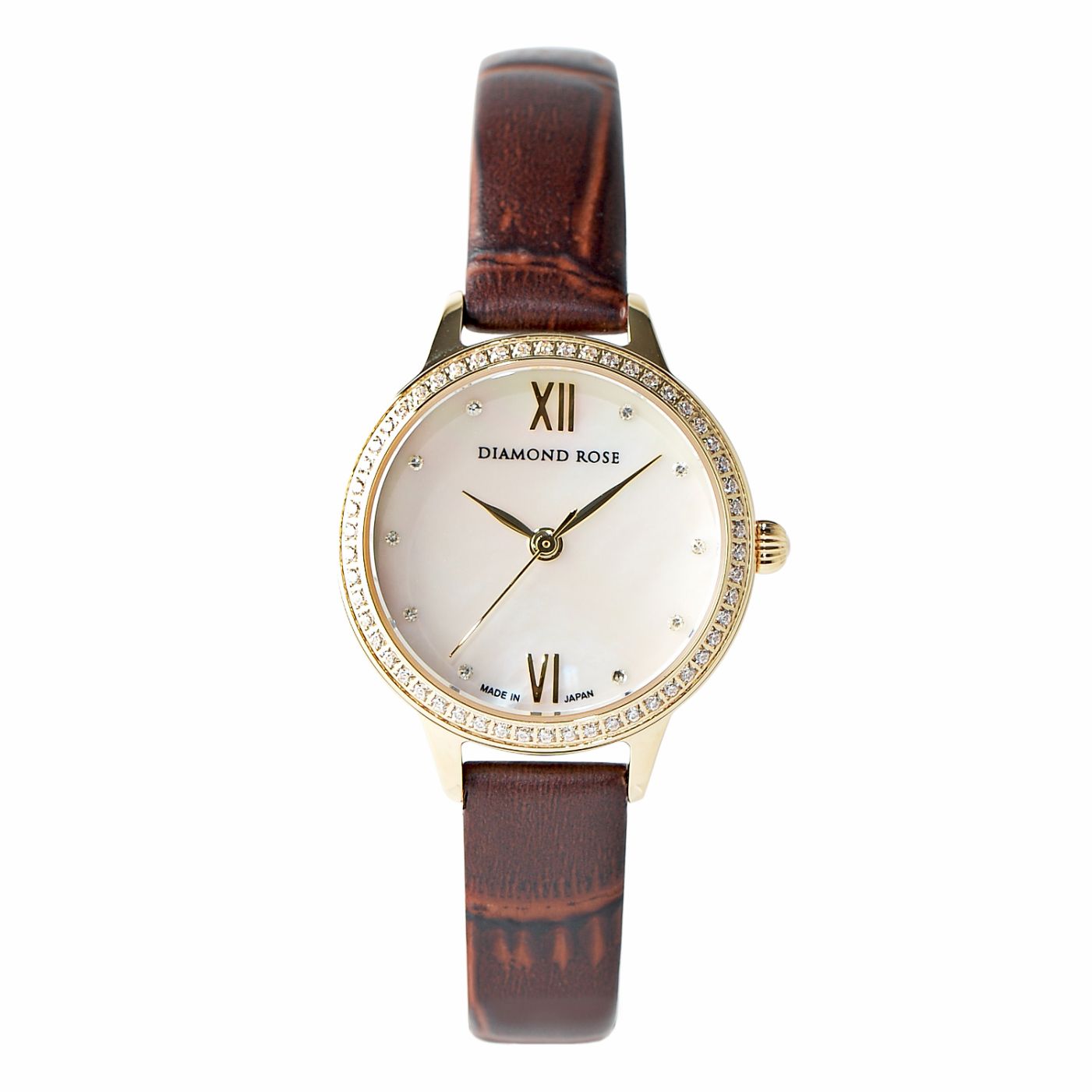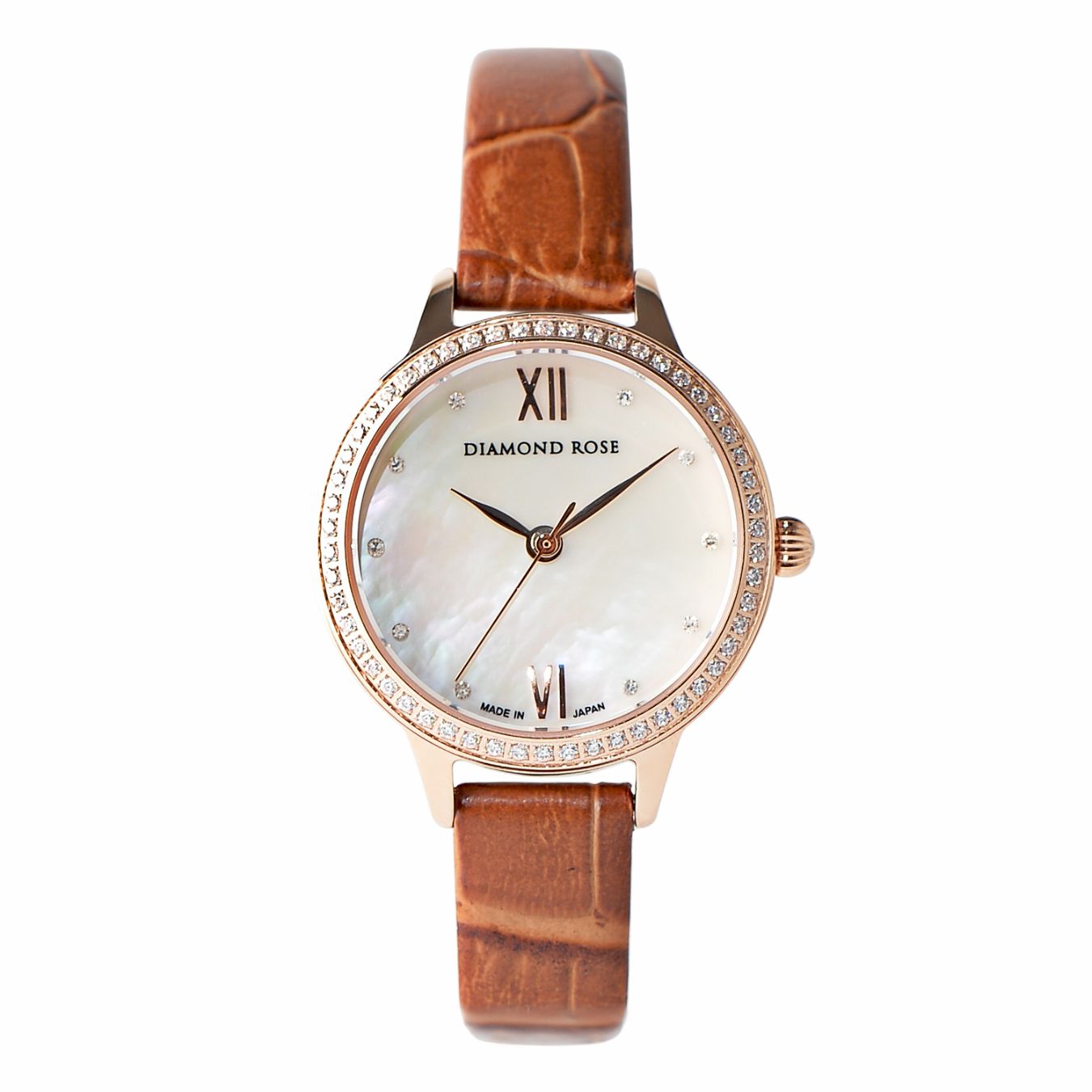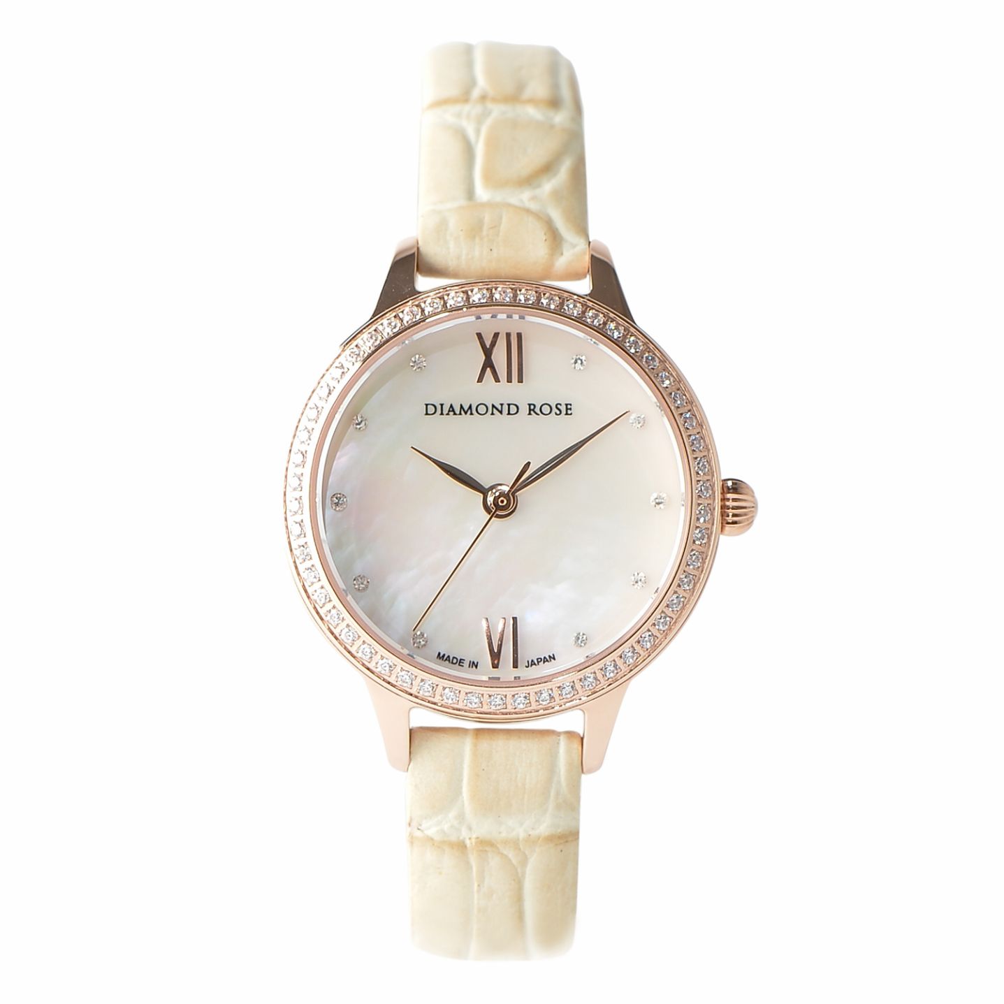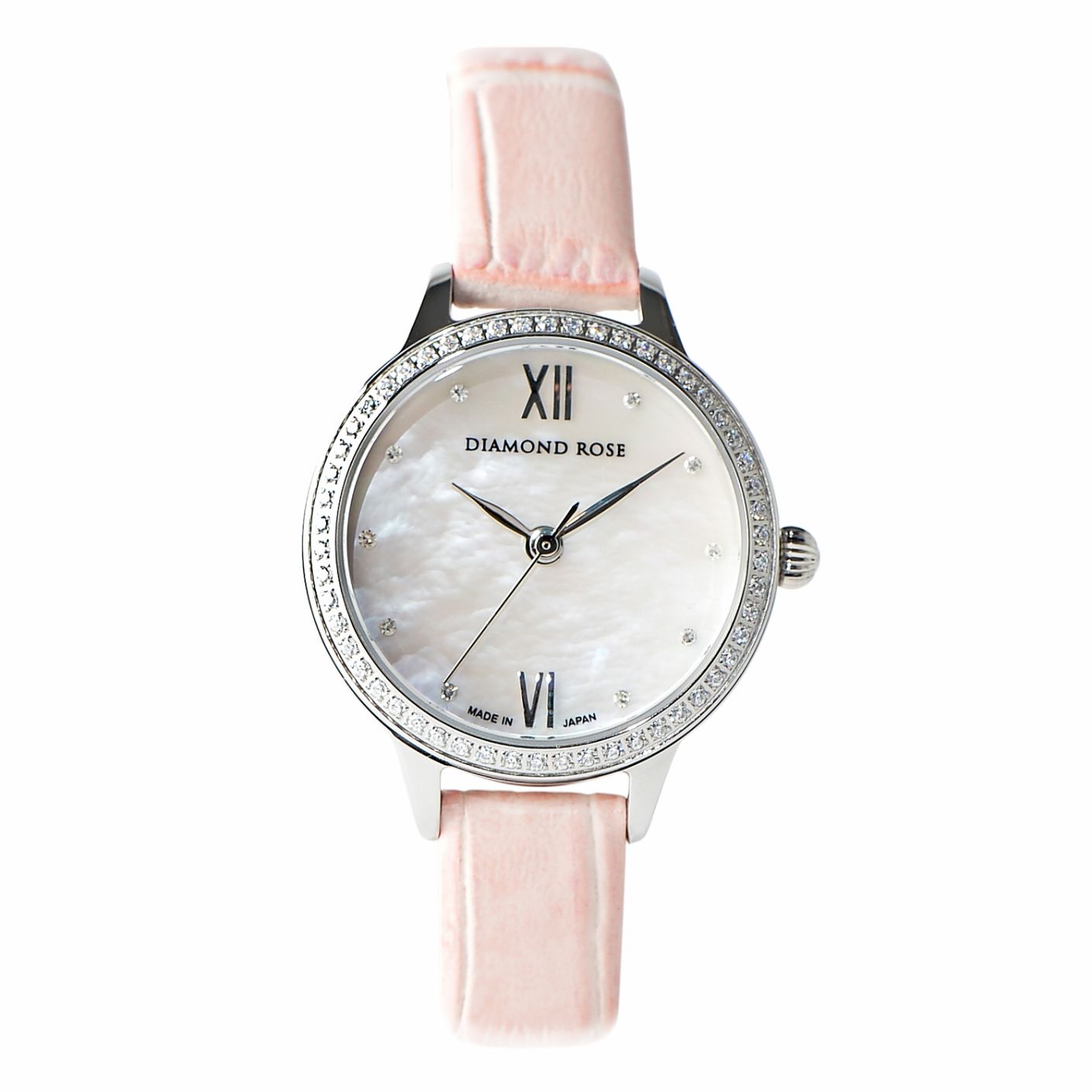 時計には業界基準として世界中の多くのウォッチブランドに採用されているムーブメントを使用、 日本国内の時計専門工場で徹底した品質管理のもと組み上げられ、独自の厳しい検品基準を満たしたもののみをお届けしております。 本物の天然ダイヤモンドとラメをまとった特別なプリザーブドローズは、インテリアとしてお部屋に飾っていただくと華やかな雰囲気に。 素敵な時間をお過ごしください。 天然マザーオブパールを文字盤に使用し、VSクラスの天然ダイヤモンドをインデックスとして十箇所に配置しました。 ケースベゼルはジルコニアを散りばめてており、その眩く美しい輝きは見る人を魅了します。 また、硬度の高いサファイアガラスを使用しているので傷にも強く視認性に優れています。 こだわりのレザーバンドは本牛革を使用しており、クロコ調のテイストが高級感を漂わせます。裏地にはスウェード生地を使用し高い耐久性と撥水性があり肌触りも抜群です。