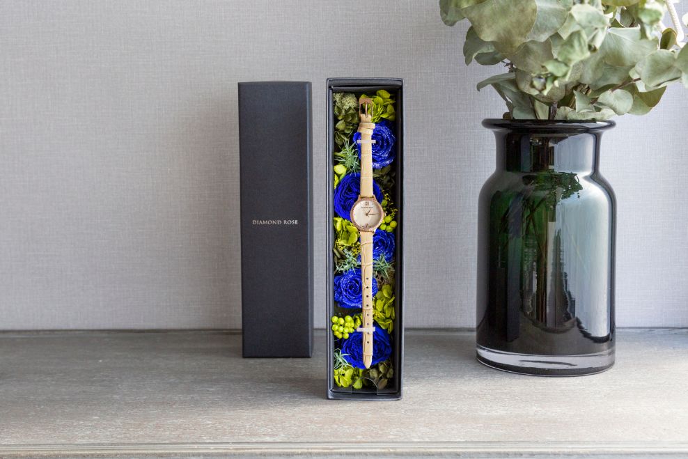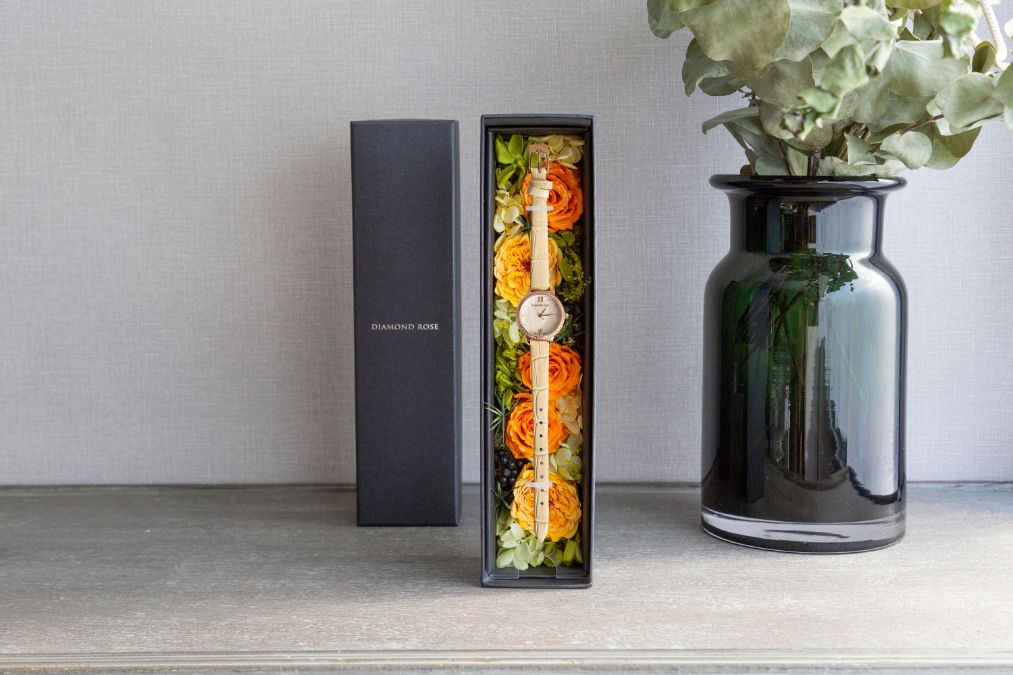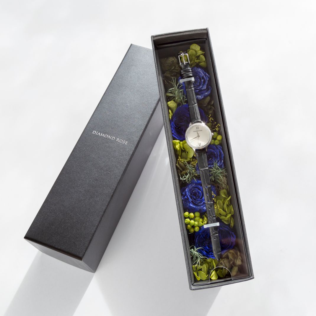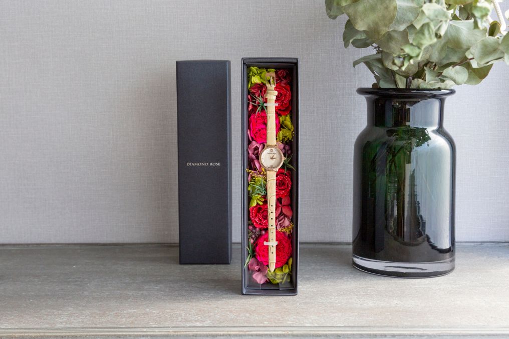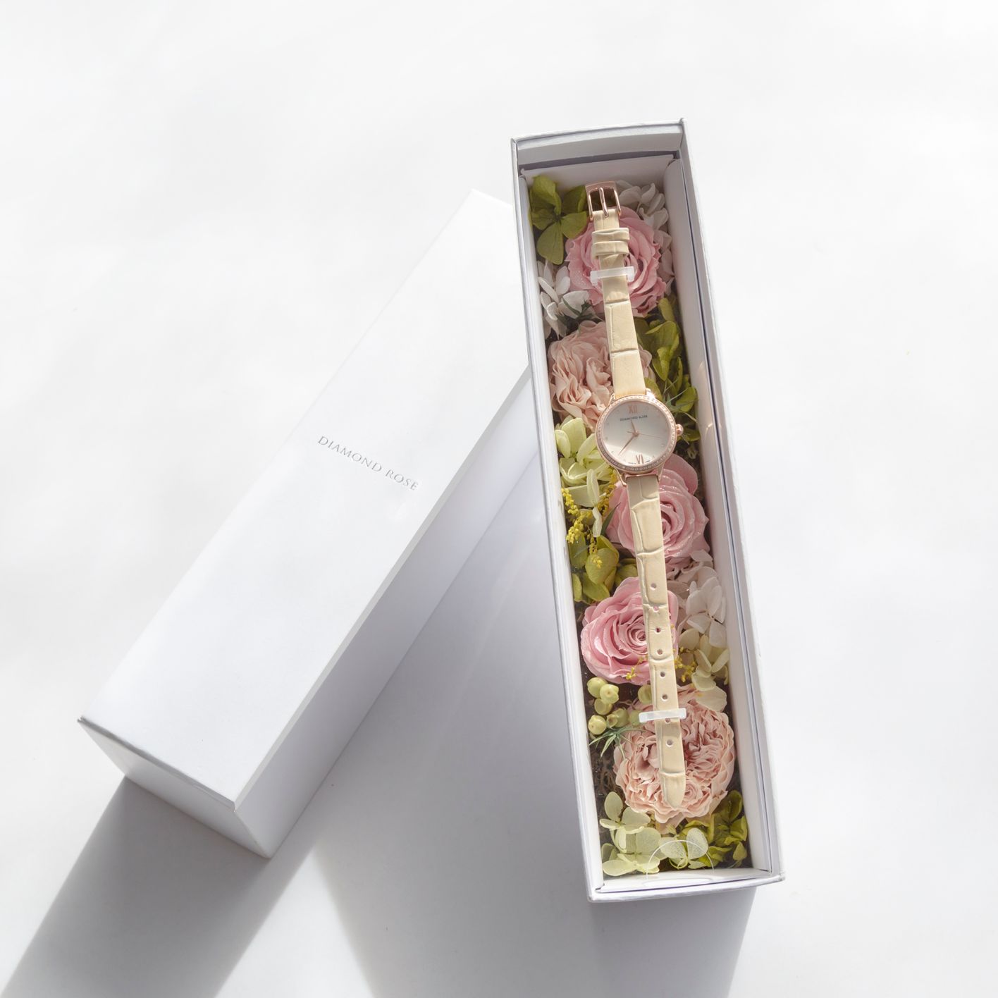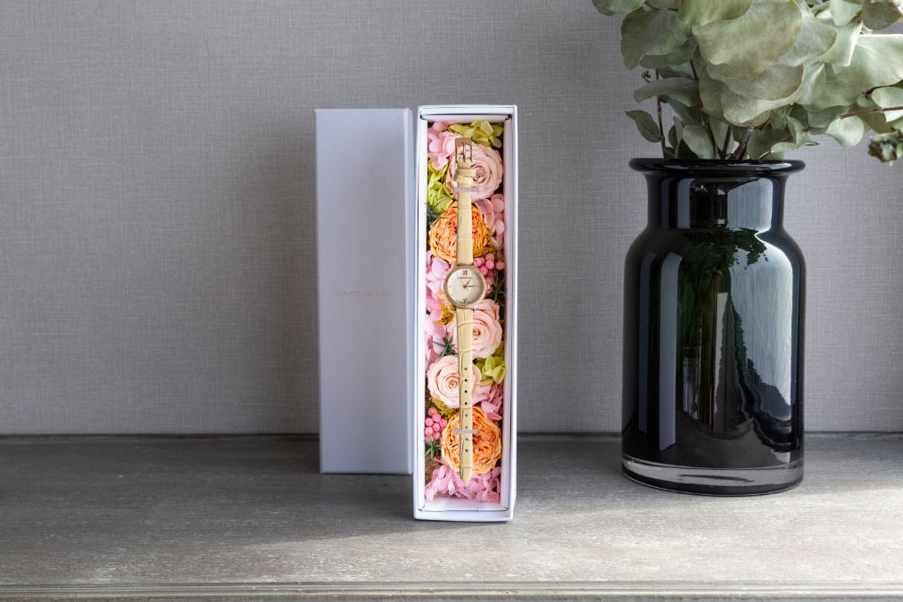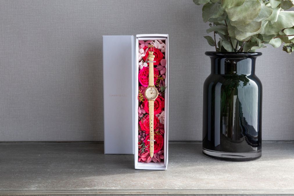 確かな品質と上質なデザインを兼ね備えた時計と付属の専用ギフトボックスにはダイヤモンドの繊細な輝きを宿すプレミアムなローズをアレンジしました。