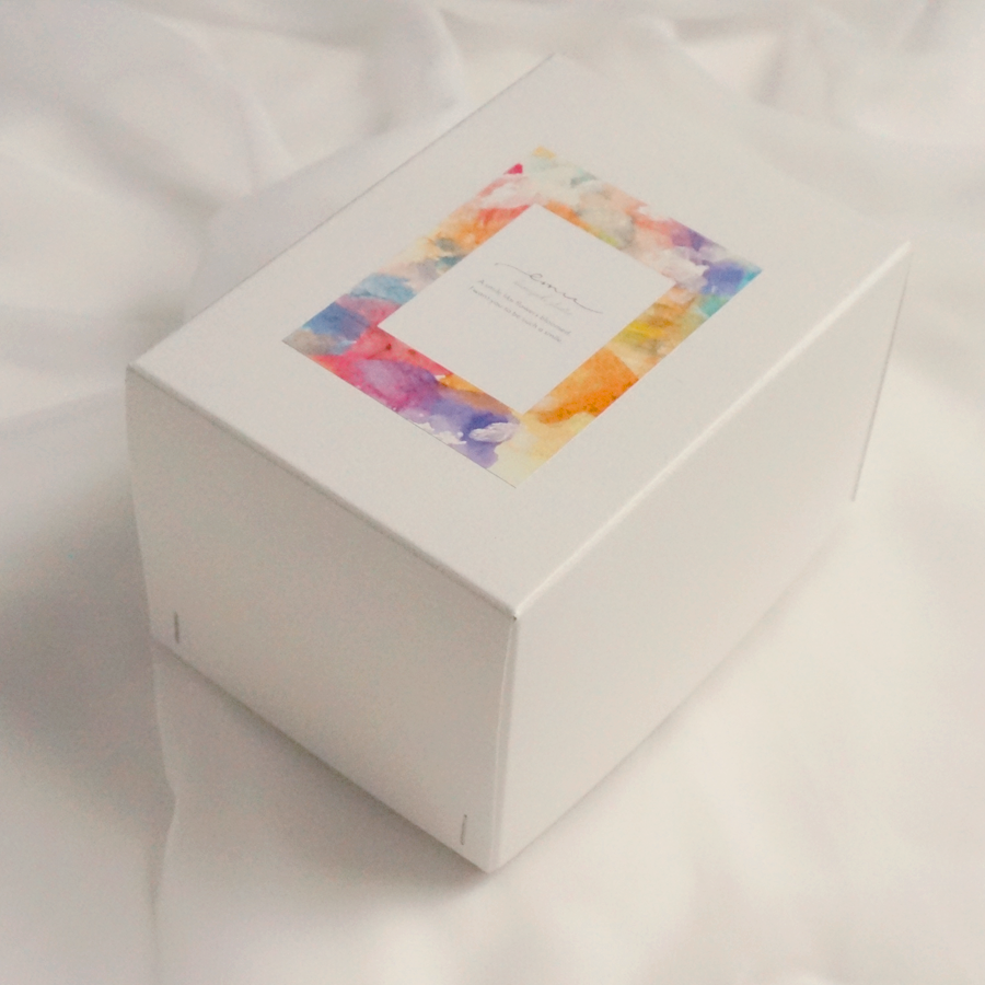 白を基調にした上品なボックスをご用意しています。 ラベルは弊社オリジナルデザインです。 蓋を開ける瞬間も楽しんでいただけるような、お花畑のようなカラフルなデザインです。