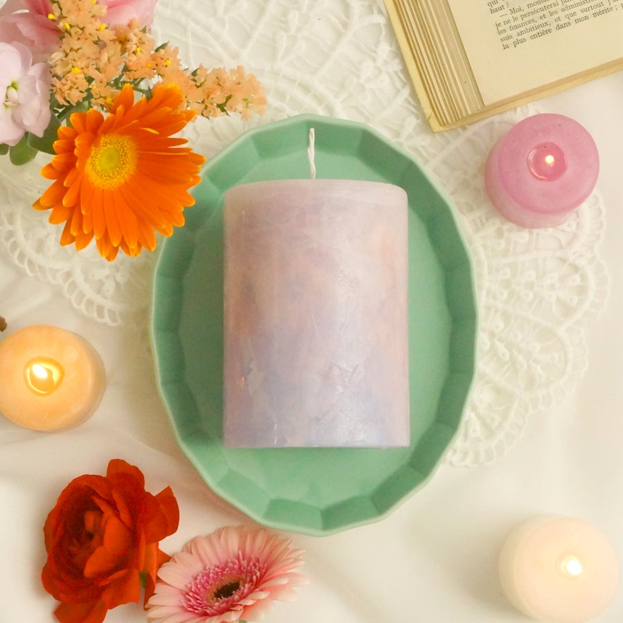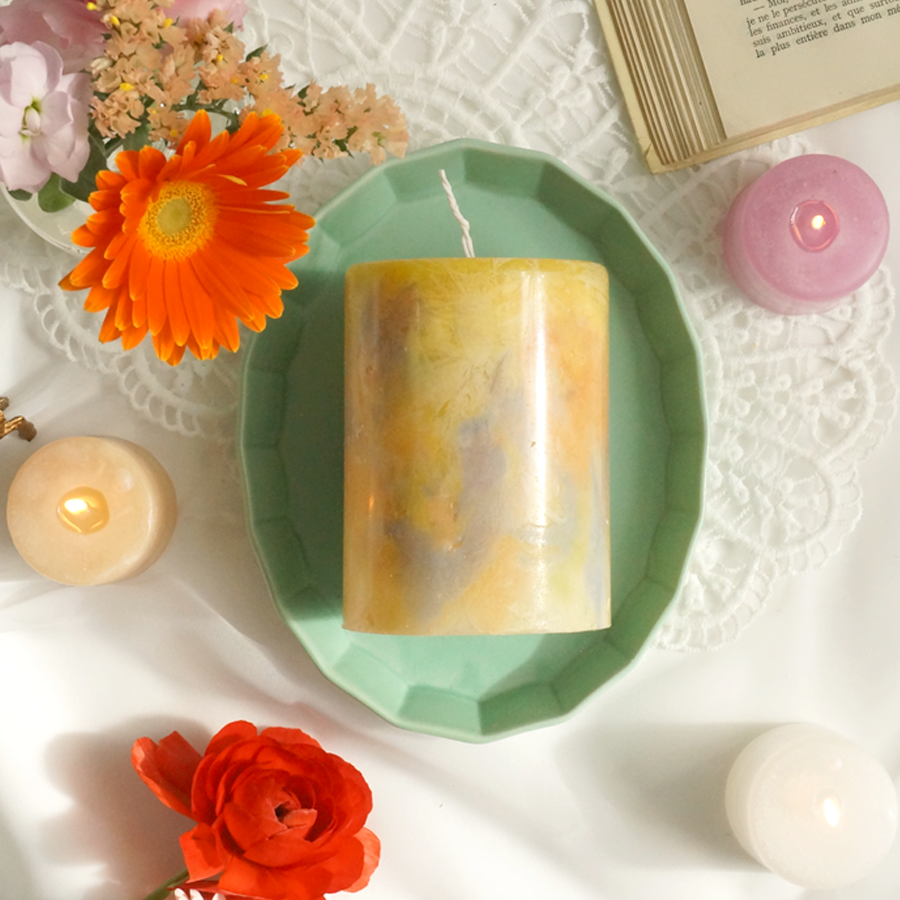 キャンドル専用の顔料を使用し、着色しています。 1色ずつ繊細な色合いを出すためにこだわりました。 また重厚感あるサイズなのでお部屋のインテリアや、ディスプレーなどにもぴったりです。火を灯していくと、表面の色の影が透けて幻想的な光を放ってくれます。
