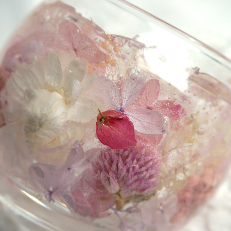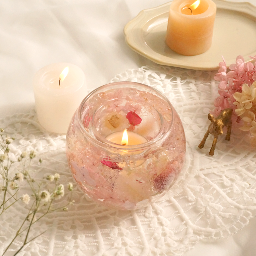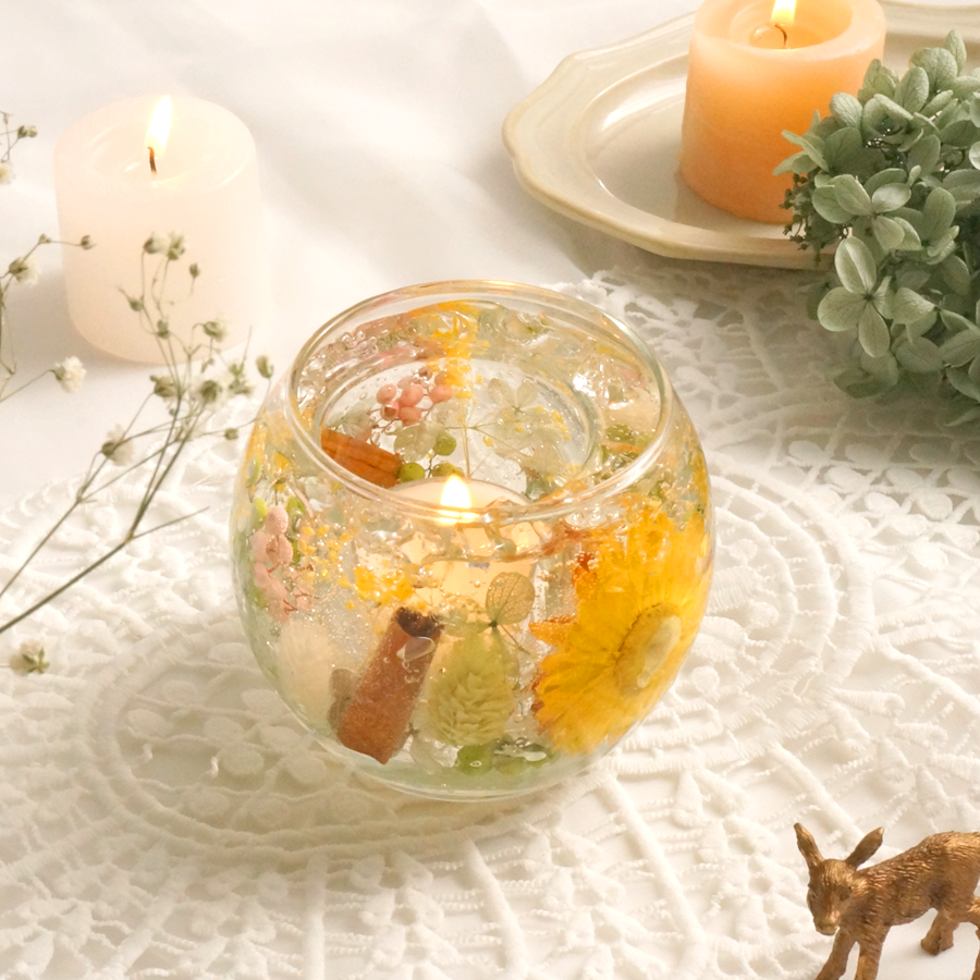 大口注文・法人のお問い合わせはこちらリラックスタイムはももちろん、お祝いのお食事の場などその場を華やかにしてくれるお花がたくさん詰まったキャンドルホルダーです。 付属のティーライトキャンドルを入れて火を灯します。 火を灯すとジェルが光に透けてとても幻想的です。