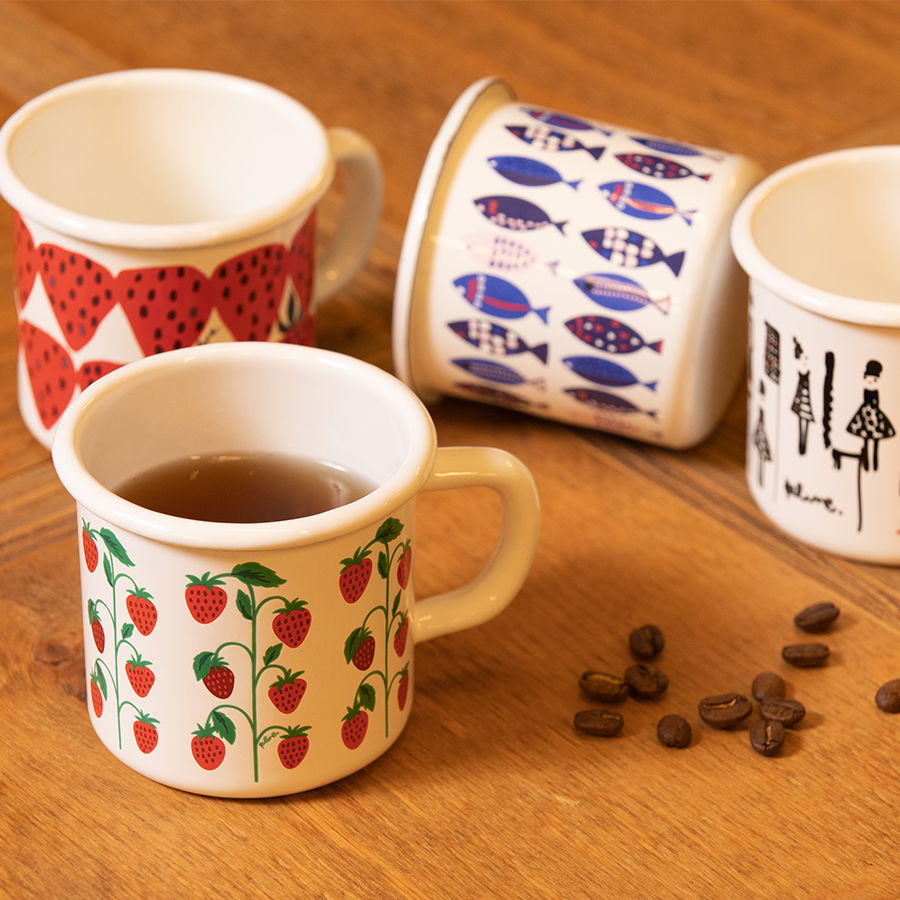 かわいいデザインが楽しいティータイムを演出するホーロー製マグカップ。 ご自身でのご使用はもちろん、ギフトや贈り物にぜひいかがでしょうか。