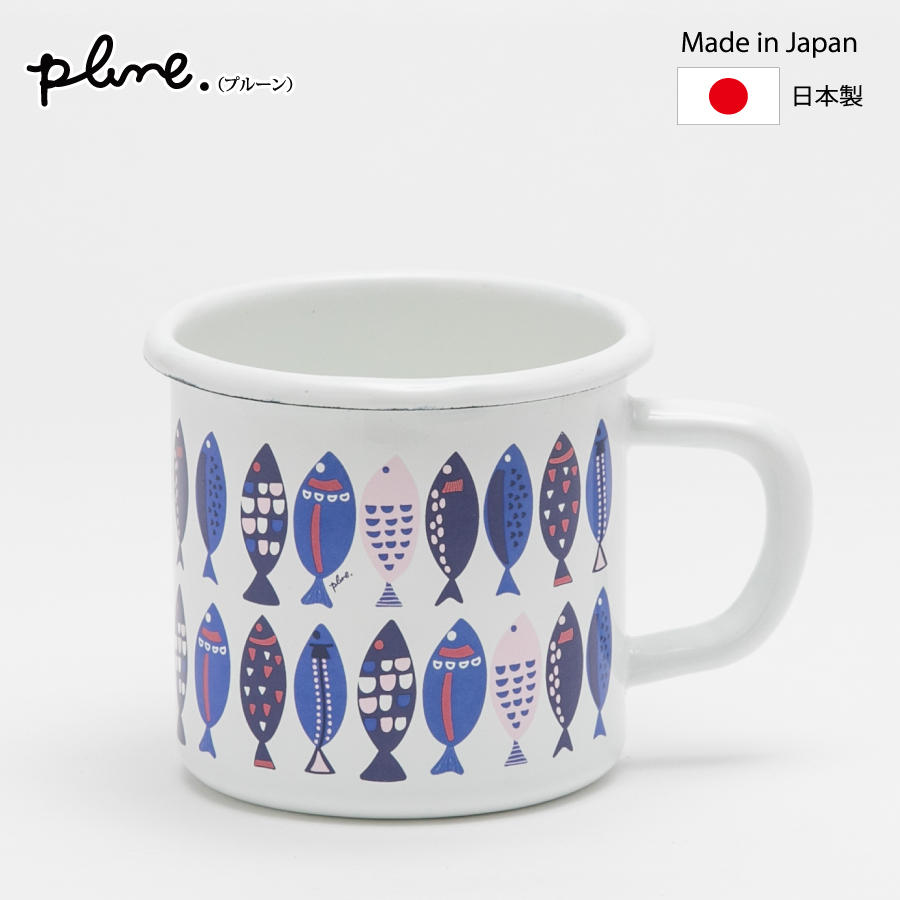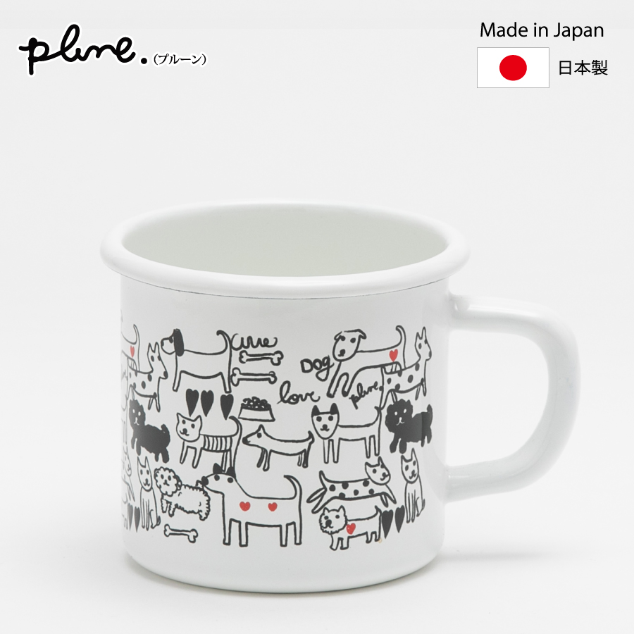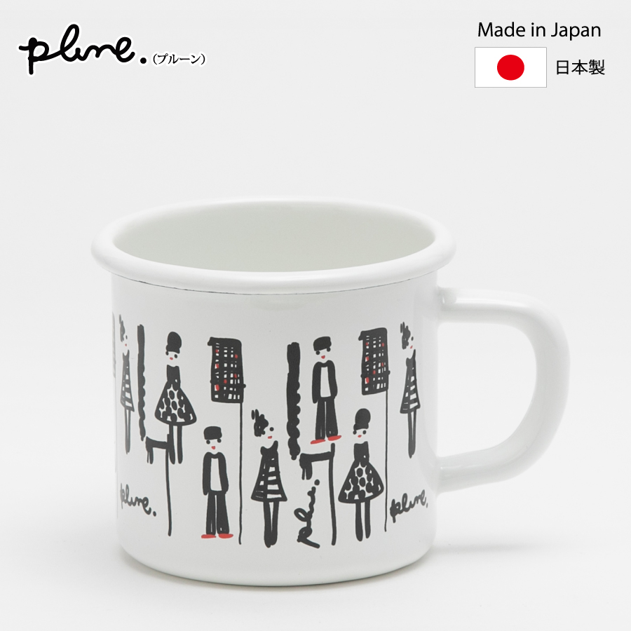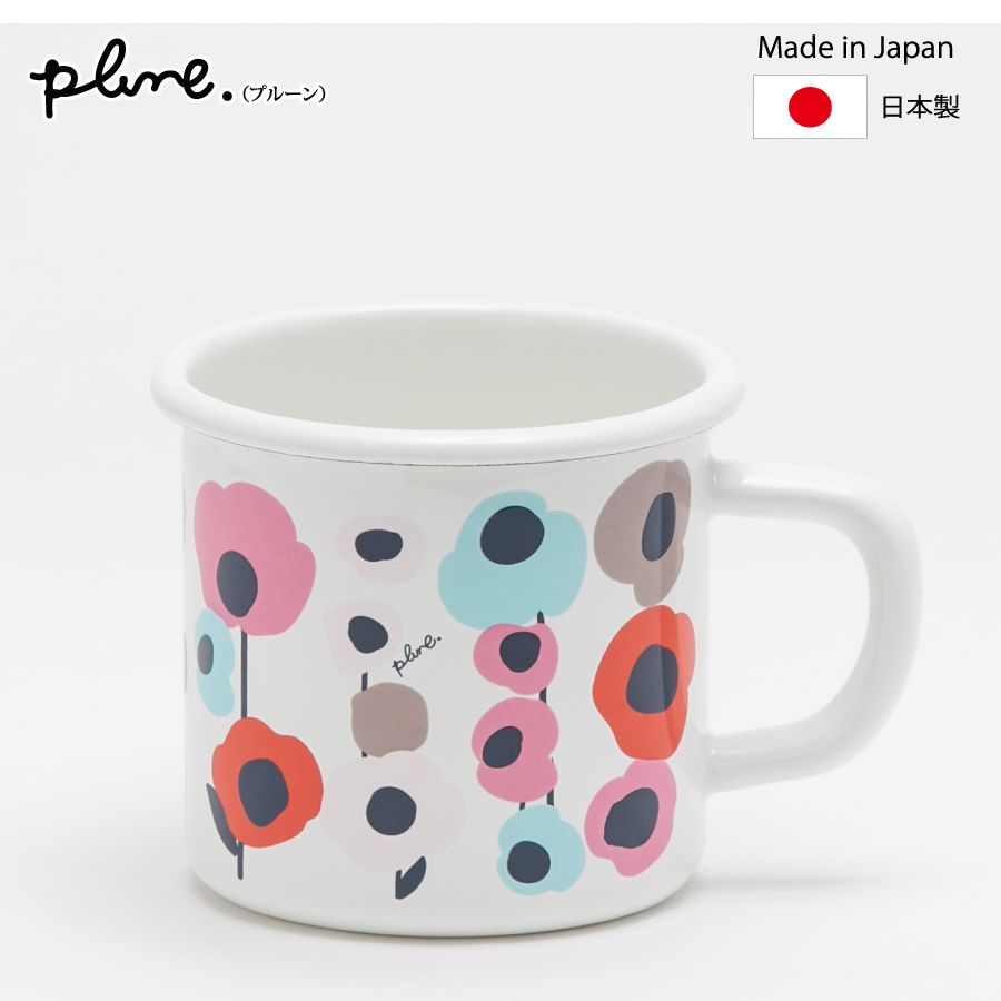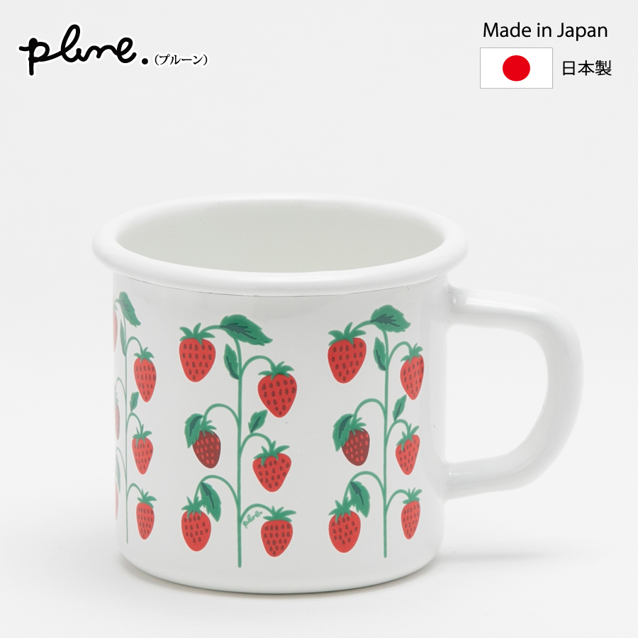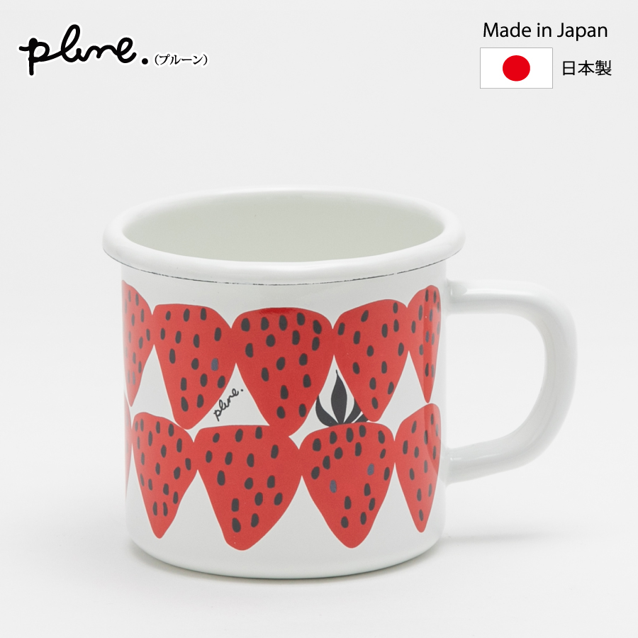 大口注文・法人のお問い合わせはこちら耐久性、耐熱性、保温性に優れたホーロー製マグカップです。 ホーローの美しい光沢と色合い、プルーンのかわいいデザインが楽しいティータイムを演出します。
