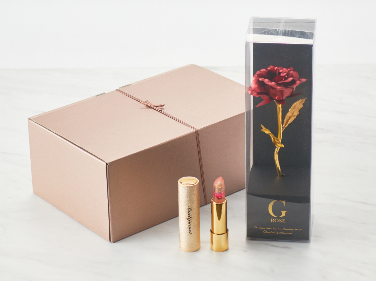 ①kailijumeiは、愛用している女性が多くいる人気のリップ。 透明なリップに鮮やかなお花が入っているため、 持ち歩く可愛いアイテムとしても人気です。 基本的にはナチュラルな色付きなので、どんな方でも使いやすいリップです! ②生花を送るのは枯れちゃったりするかもしれないから心配...という方にもおすすめなのがお花のオブジェ。 光に当たるとキラキラと輝くゴールデンローズはインテリアとしてお楽しみいただけます。