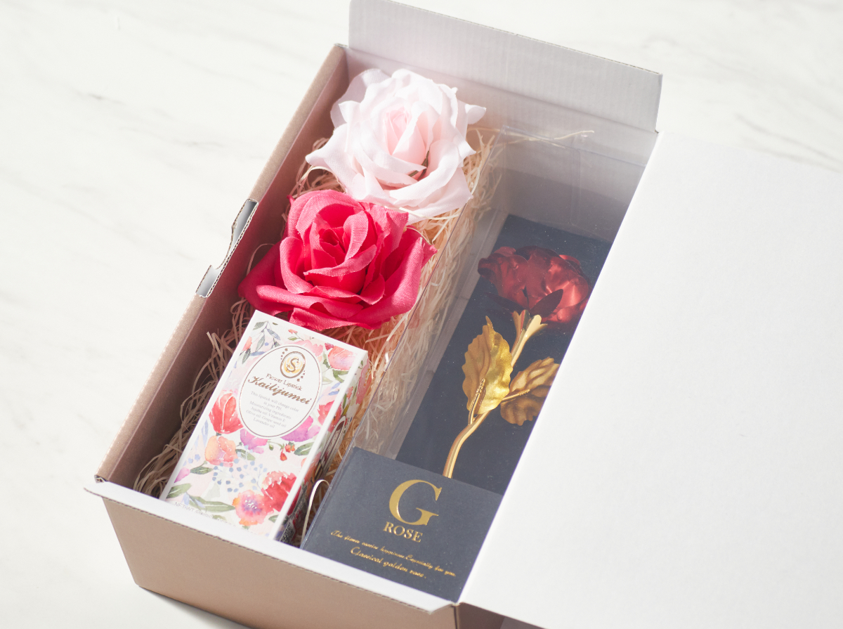 専用ギフトボックスに商品を入れてお届けいたします。 リップのパッケージ、ゴールデンローズにぴったりの華やかな装飾を施してお送りさせていただきます。 ※造花の色は画像のものと異なる場合がございます。ご了承ください。