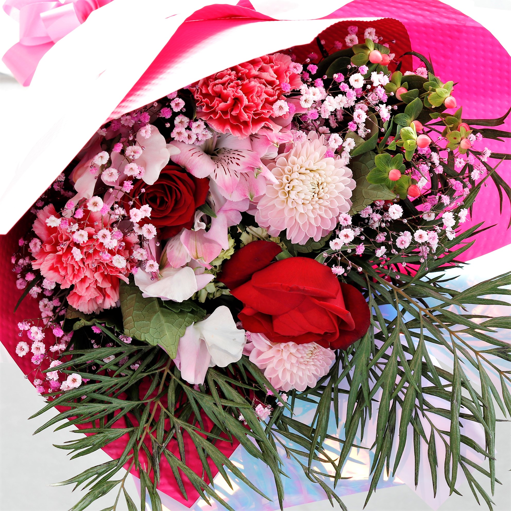 バラ、ガーベラ、カーネーションに加え、季節のお花やグリーンをMIXし色鮮やかに彩りを添えます。